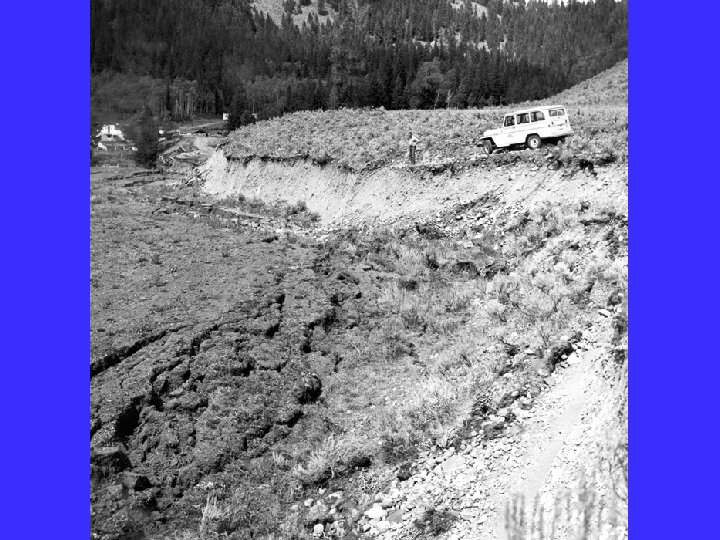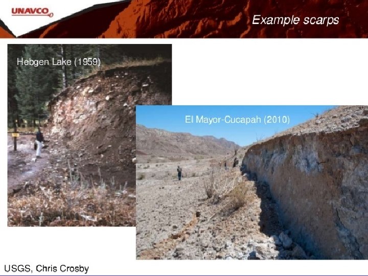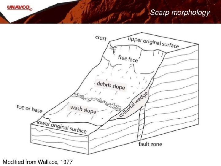 Scarp Morphology in Alluvial deposits Most of the scarps you will map are located in alluvial fan deposits, - that is they offset young sediments. Scarp height depends on the size and number of earthquakes that produce them. Scarps are a record of strain preserved since the fan surface was abandoned, or in young cases have not yet been buried. Scarps start off as nearly vertical surfaces called free faces that erode quickly with time (in most arid environments, they don’t last more than a couple of hundred years). Young scarps have a debris slope (from alluvium falling off the free face) and a wash slope, formed by erosion during rainfall. Scarps “diffuse” with time and become more gently shaped as erosion of their crest and deposition at their base occurs. Refreshed scarps are typified by a beveled crest where a diffused (older) scarp was offset again by a younger earthquake.