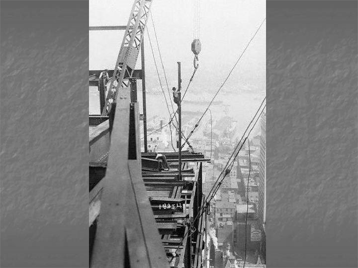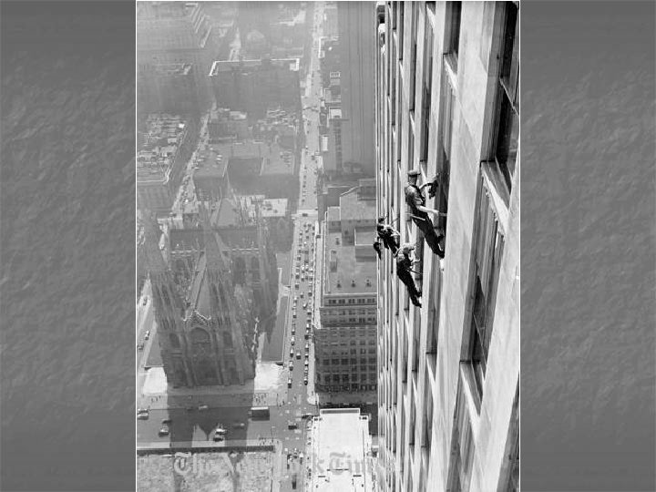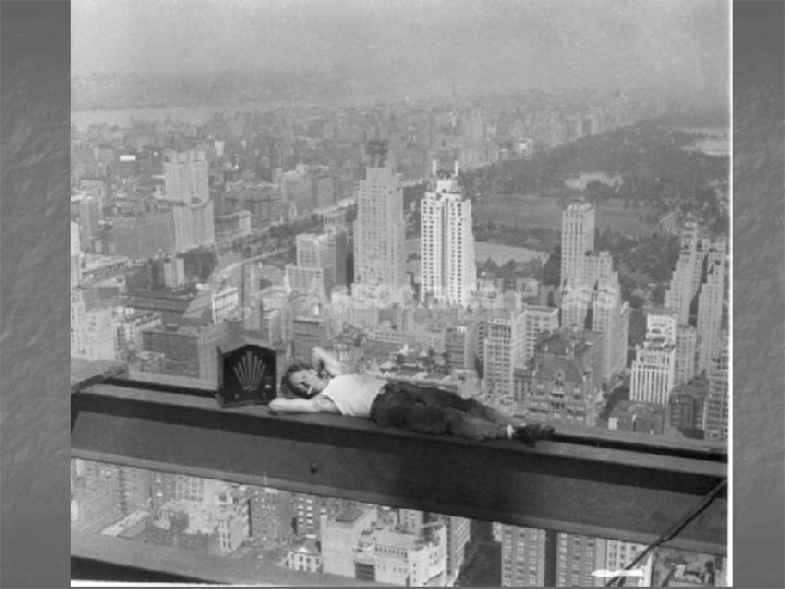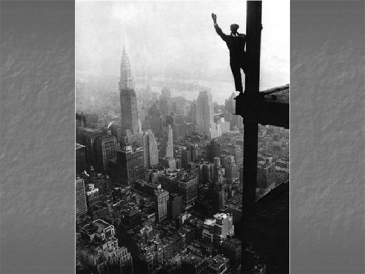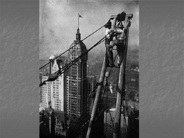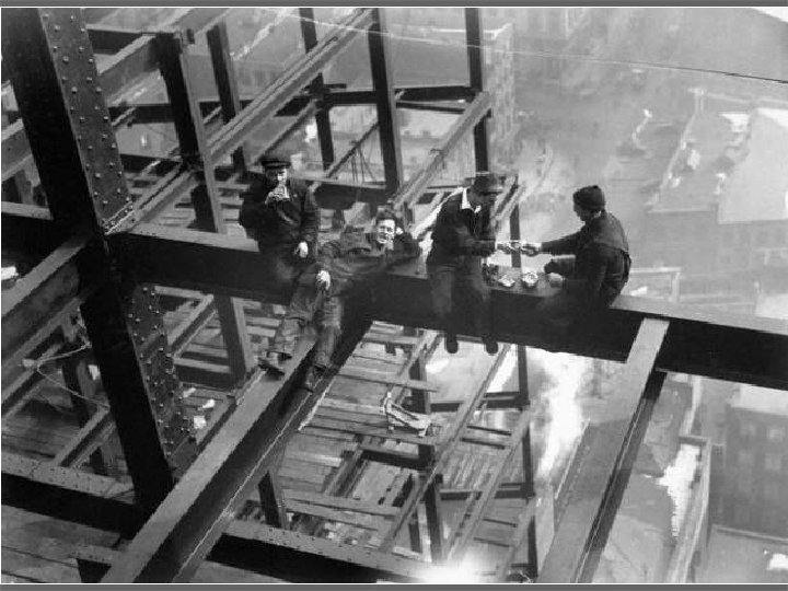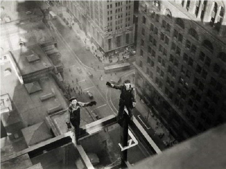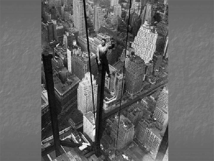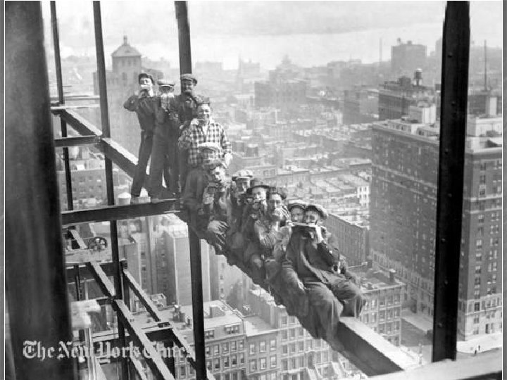 Las fotos de esta presentación, son fotos reales. Alguna de ellas son fotografías históricas y fueron realizadas por Charles Ebbets a principios de los años 30. La mayoría no son posadas y corresponden a escenas cotidianas de los obreros que participaron en la construcción de los rascacielos entre 1920 y 1935. Como podréis observar, las medidas de seguridad eran un tanto peculiares y las fotos se hicieron intentando denunciar esa situación.