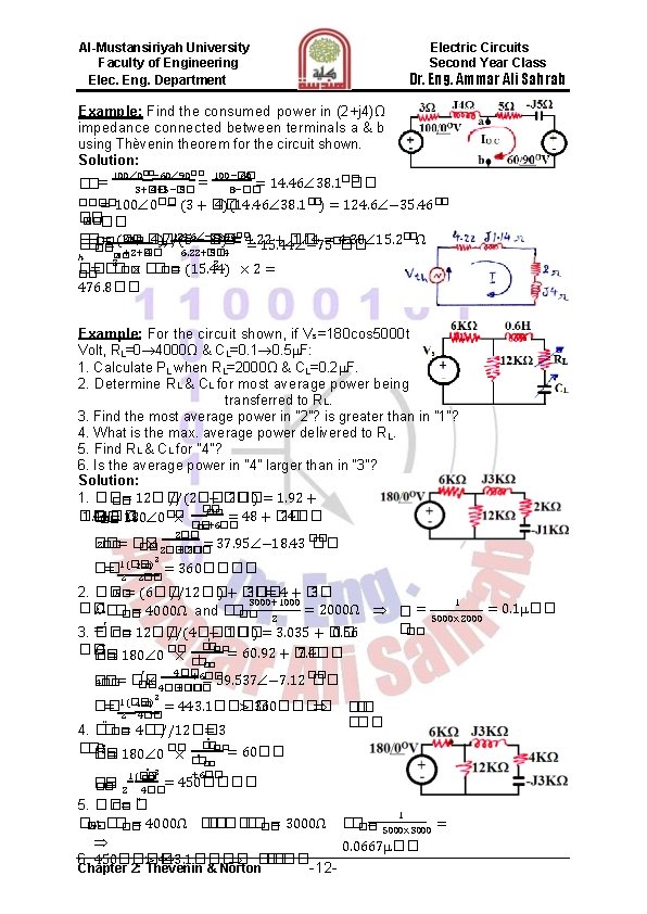 Al-Mustansiriyah University Faculty of Engineering Elec. Eng. Department Electric Circuits Second Year Class Dr. Eng. Ammar Ali Sahrab 1. Thèvenin & Norton Equivalent Circuit: Thevenin’s theorem states that a linear two-terminal circuit can be replaced by an equivalent circuit consisting of a voltage source VTh in series with a impedance ZTh, where VTh is the open-circuit voltage at the terminals and ZTh is the input or equivalent impedance at the terminals when the independent sources are turned off. Norton’s theorem states that a linear two-terminal circuit can be replaced by an equivalent circuit consisting of a current source IN in parallel with impedance ZN, where IN is the short-circuit current through the terminals and ZN is the input or equivalent impedance at the terminals when the independent sources are turned off. Thèvenin & Norton equivalents are circuit simplification techniques that focus on terminal behavior. Thèvenin & Norton equivalent circuits are used to represent any circuit made up of linear elements. In circuit analysis we want to replace the circuit between terminals a & b by an equivalent voltage or current source with internal impedance. Zth a Vth a Equivalent Thèvenin Circuit IN b ZN Equivalent Norton Circuit b Note: When computing Zth or Z N the independent voltage sources are short circuited and independent current sources are open circuited. Example: Find the equivalent Thèvenin & Norton circuits between terminals a & b in the circuit shown. Solution: Using voltage divider rule. Vth 10 0 O 3 j 4 5 j 2. 5 5. 59 26. 6 O V 5 3 j 4 5 (3 j 4) Z th Z N j 5 2. 5 j 6. 25 5 3 j 4 6. 732 68. 2 O 5 V 3 j 4 10 0 O Z P 4. 152 48. 4 O V 5 ZP j 5 (3 j 4) Z (0. 833 where P j 2. 5) j 5 3 j 4 4. 152 48. 4 O V O I N 3 j 4 0. 621 j 0. 552 0. 831 41. 6 A j 5 Chapter 2: Thevenin & Norton -10 - 10 0 O V j 5 3 j 4 a Vth b IN