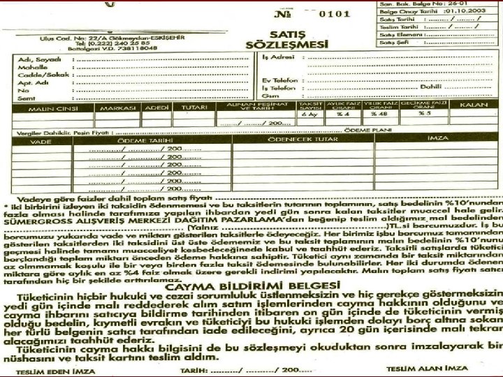 TAKSİTLİ SATIŞ Satım bedelinin en az 2 taksitle ödendiği ve malın veya hizmetin sözleşmenin düzenlendiği anda teslim veya ifa edildiği satım türüdür. Satışta sözleşmenin yapılması ve suretinin tüketiciye verilmesi zorunludur. İsim, ünvan, adres belirtilecek. Vergiler dâhil peşin fiyat vadeye göre toplam satış fiyatı yazılacak. Faiz miktarı, faizin % 30 unu geçmemek üzere gecikme faizi, % 30 Peşinat tutarı, ödeme planı, borçlunun temerrüde düşmesinin hukuki sonuçları, Senet düzenlenecekse bu senet her bir taksit ödemesi için ayrı olacak şekilde ve sadece nama yazılı olarak düzenlenecektir. Aksi takdirde Kambiyo senedi geçersizdir.