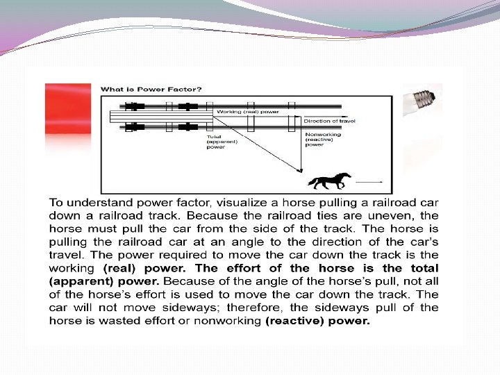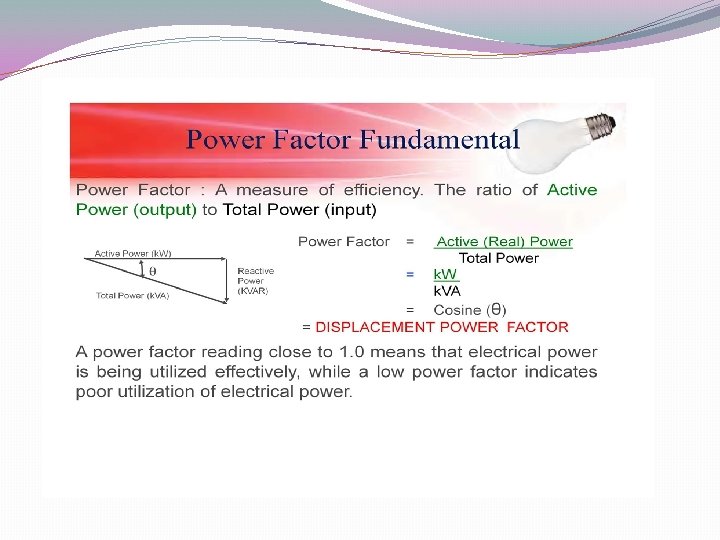 �Unity power factor �For a purely resistive circuit, the power factor will be one �For load containing resistance and inductance �Power factor will be less than one and lagging �Current lags the voltage �The power factor is unity (one) when the voltage and current are in phase. It is zero when the current leads or lags the voltage by 90 degrees. Power �factors are usually stated as "leading" or "lagging" to show the sign of the phase angle of current with respect to voltage.