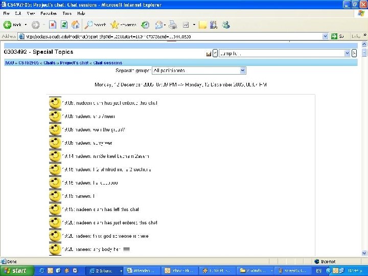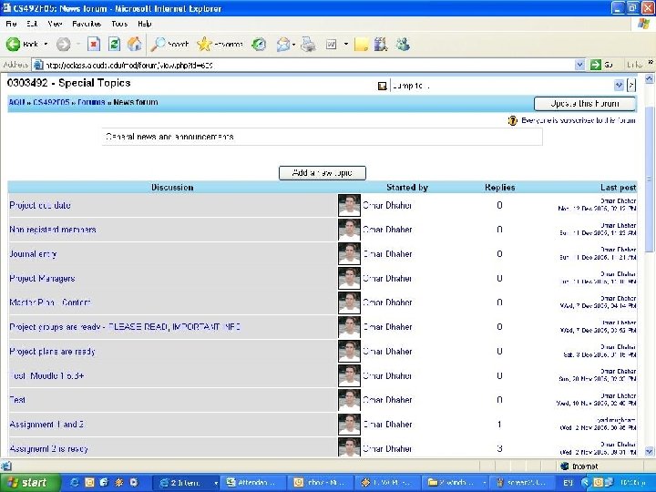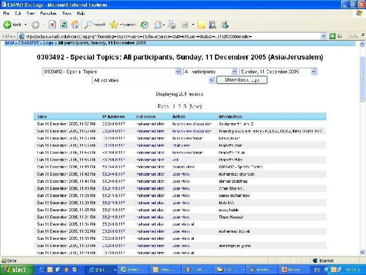 Time line Date Action Summer 2004 Installation and use of Claroline Fall 2004/5 Installation and use of Moodle Spring 2004/5 Use of Moodle still limited to the CS and IT depts. Summer 2005 Use of Moodle still limited to the CS and IT depts. Fall 2005/6 Other faculties started to use Moodle. Total number of classes: 52! End of Fall 2005/6 Training sessions are to e conducted (starting December 20 th) to train all academic staff on the use of Moodle