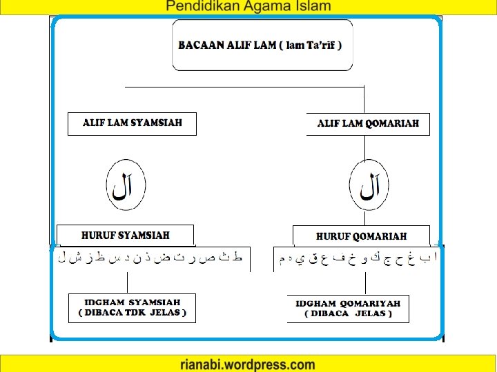 Perhatikan contoh ﺍﻟ di baca Asy-Syamsu, bukan Al -Syamsu. Alif lam pada kata di atas bertemu dengan salah satu huruf Syamsiyah yaitu Syin ( )ﺵ. Maka alif lam tidak dibaca al, melainkan dibaca asy. Sehingga kata tersebut dibaca asy syamsi. Itu karena alif lam ( )ﺍﻝ melebur ke dalam huruf Syin ( )ﺵ. Hukum bacaan alif lam yang bertemu dengan huruf Syamsiyah disebut dengan alif lam Syamsiyah atau Idgham Syamsiyah. Jika diperhatikan lagi, kita akan mendapati adanya tanda baca tasydid/syadda ) di atas huruf Syamsiyah. Tanda baca ini merupakan ciri khas Contohdari lain bacaan Idgham dari bacaan Syamsiyah. Idgham Syamsiyah ﺍﻟ ﺍ DIBACA : WAS SAMA-I WATH THORIQ TIDAK DIBACA : WAL SAMA-I WAL THORIQ