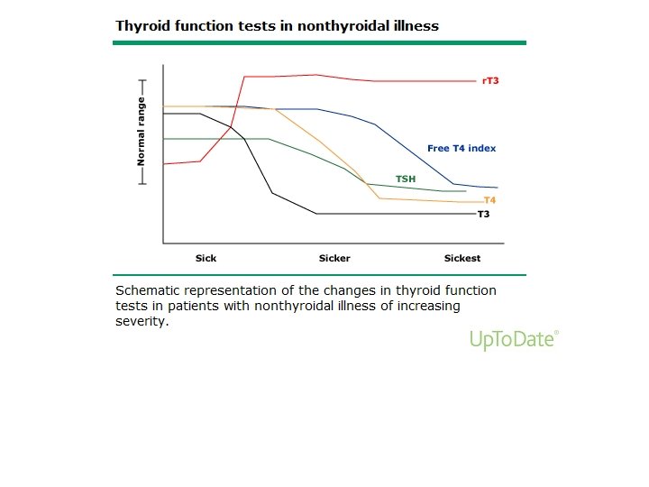 Sd. Eutiroideo enfermo. • Tb llamado Sd T 3 bajo • Alteraciones en los test de función tiroidea que incluyen T 3 l bajo, con T 4 l normal (tb leve descenso o leve aumento) y T 3 r alta. • Afectan al 75% de los pacientes ingresados • Comienza a las pocas horas de la enfermedad. • Se relaciona con la gravedad. • Factor pronóstico. • Tratamiento? ?