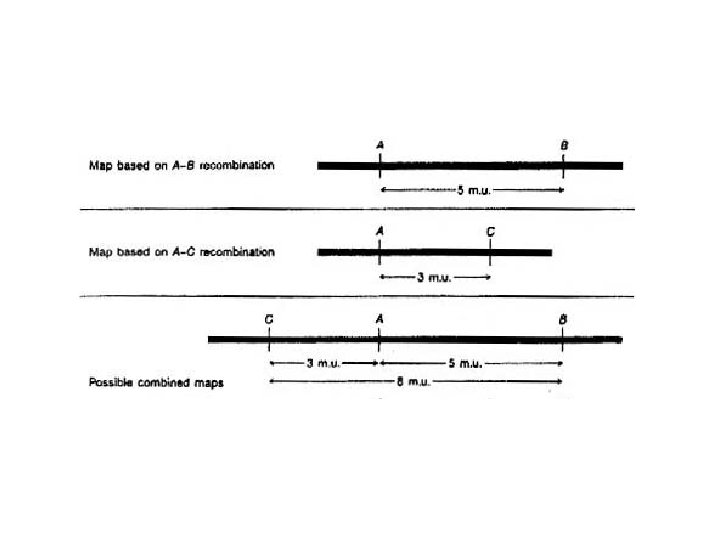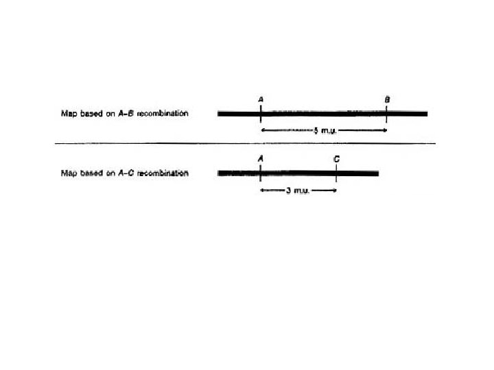 Genetic distance Measure of genetic distance is the recombination frequency among two loci. In result of multiple crossing over distances between loci are not additive: if loci sequence ABC, then r. AC < r. AB + r. BC Frequency of the double crossing over among loci A and C – r. AB x r. BC Max of possible recombination frequency among two loci – 50 %