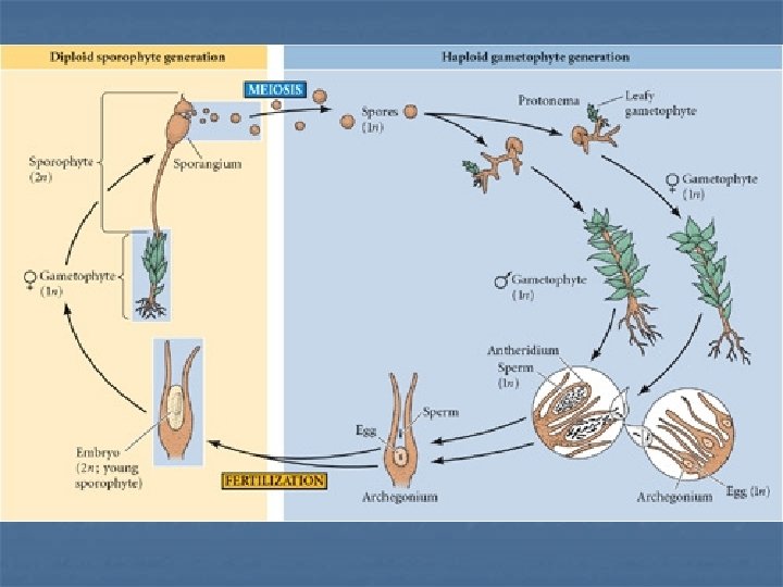 Life Cycle of Mosses n n Some mosses: male and females form on separate gametophytes, others species on same gametophyte. Has _______ archaegonia (egg-producing) & ________ (sperm-producing) antheridia