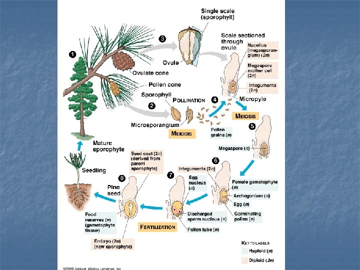 Life cycle of Conifers n n The _____phyte sporo is dominant. Adult sporophyte produces male & female coneson ______ separate branches of one plant