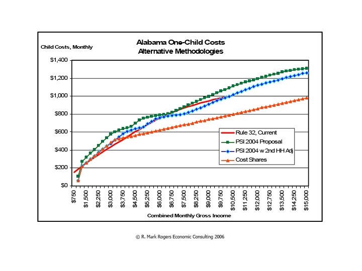 Alternative Child Support Models • Income Shares -- Robert Williams • Percentage of Income -- Irv Garfinkel • Melson -- Judge Melson (Delaware) • Hybrid Approaches -- Massachusetts and DC • Cost Shares -- Donald Bieniewicz and Mark Rogers • American Legal Institute (ALI) -- Ira Ellman and Grace Blumberg