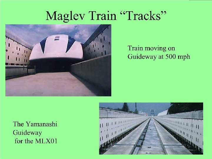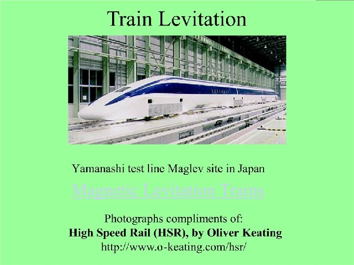 Electrodynamic Suspension Models l EDS is used in Japan – Train levitates 10 cm off track – Train rolls on rubber wheels until “take off” speed of 25 mph l Wheels can be also be used if the electromagnet fails EDS in Japan http: //www. rtri. or. jp/rd/maglev/html/eng lish/maglev_frame_E. html