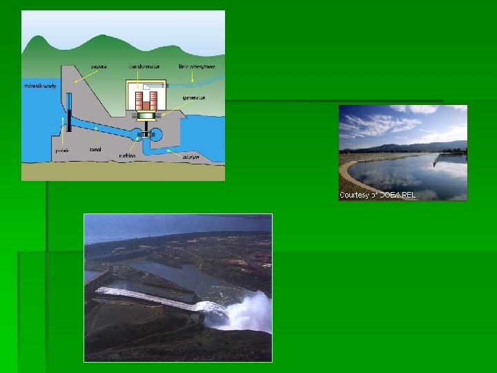 Energia wody § Powstaje dzięki wodzie, którą zbiera się w ogromnych zbiornikach, a następnie przelewa się przez turbiny, które zmieniają energię wody w energię elektryczną