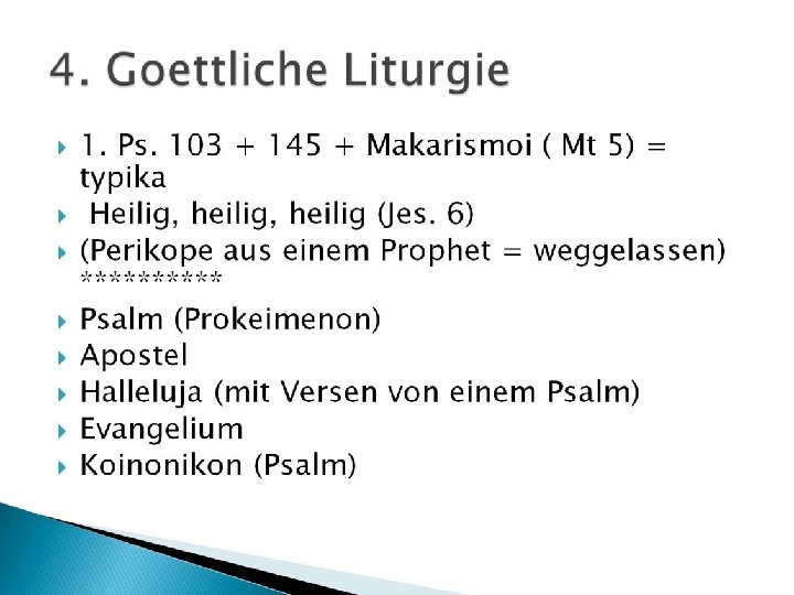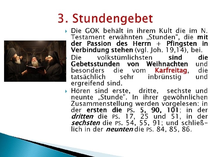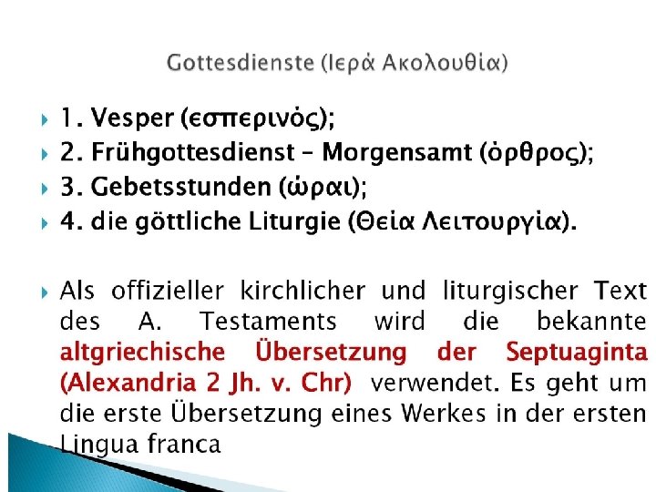 Das Alte Testament in der liturgischen Praxis der orthodoxen Kirche • 1. Die Psalmen und die Propheten in der „Großen Woche“ (Μεγάλη Ἑβδομάς) • 2. Manche Hymnen mit „antijüdischem“ Inhalt • 3. Die Nichtverwendung der Torah • 4. Die christologische Auslegung des AT • 5. Die Popularität des Psalters • 6. Die Oden • 7. Die AT-Bücher die nicht vorgelesen werden • 8. Die Verwendung der prophetischen Bücher in der Vesper • Konsequenzen