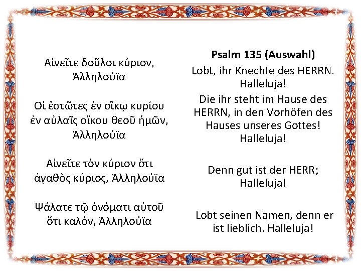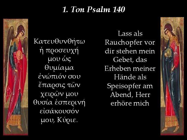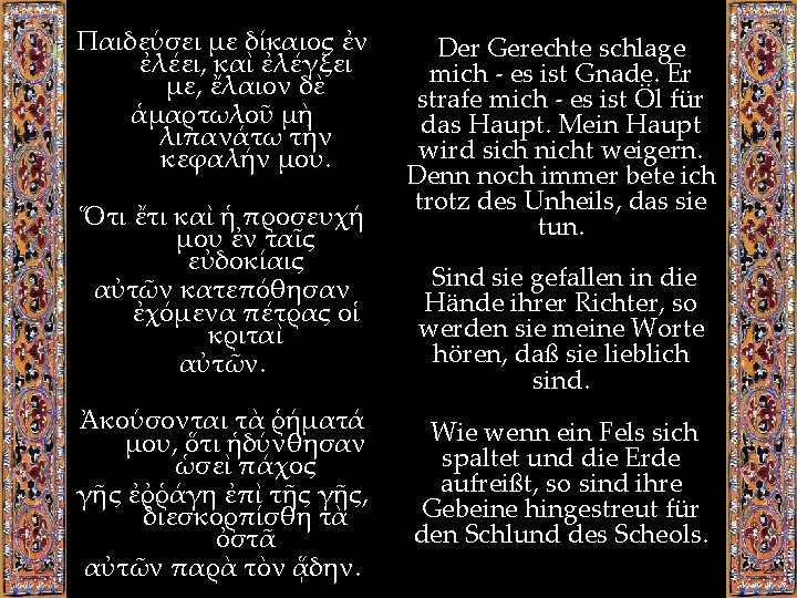 1. Vesper Bei dieser wird anfangs PS. 104 vorgelesen, bekannt als „προοιμιακός", anschließend das l. Kathisma, das aus 8 Psalmen besteht. Dann werden nach alter Tradition antiphonisch die PS. 141 142 (und 129 christlichen Hymnen vorangestellt werden. Lxx) gesungen, wobei Verse daraus den Gewöhnlich werden auch drei Lektionen aus verschiedenen Büchern des A. Testaments Pentateuch und den Propheten, den Sprüchen oder aus dem Buch Sirach und dem der Weisheit. Die Lektionen vorgelesen, hauptsächlich aus dem hängen zusammen mit dem Fest des folgenden Tages, dessen Vesper die Rolle der Vigil übernimmt.