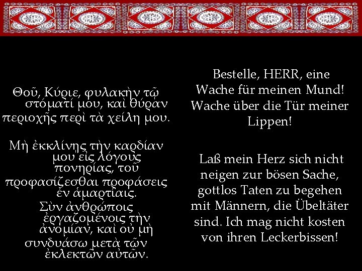 Das Alte Testament in der liturgischen Praxis der orthodoxen Kirche • 1. Die Psalmen und die Propheten in der „Grossen Woche“ (Μεγάλη Ἑβδομάς) • 2. Manche Hymnen mit „antijüdischem“ Inhalt • 3. Die Nichtverwendung der Torah • 4. Die christologische Auslegung des AT • 5. Die Popularität des Psalters • 6. Die Oden • 7. Die AT-Bücher die nicht vorgelesen werden • 8. Die Verwendung der prophetischen Bücher in der Vesper