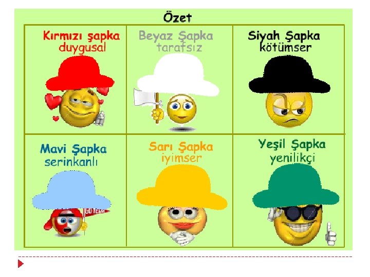 ALTI ŞAPKALI DÜŞÜNME TEKNİĞİ Edward De Bono’nun Altı Şapkalı Düşünme Tekniği'nin temelinde, altı farklı bakışı simgeleyen farklı renklerdeki şapkaları takarak düşüncelerimizi ortaya koymak ve yaratıcılığımızı geliştirmek yatıyor. Bono bu şapkaları ve işlevleri şöyle özetliyor: