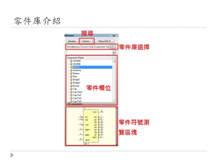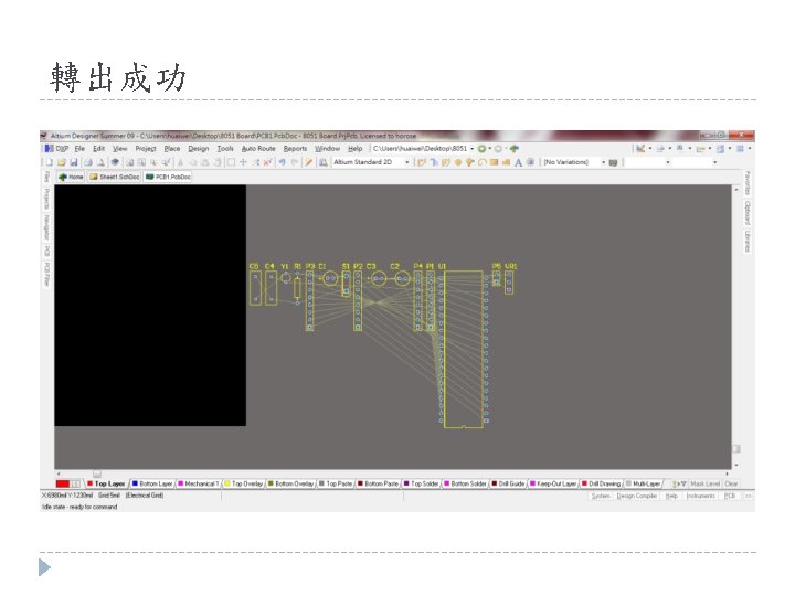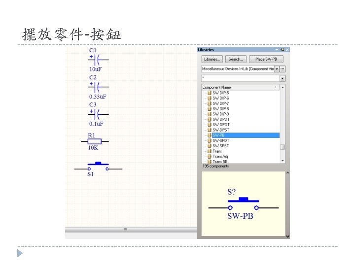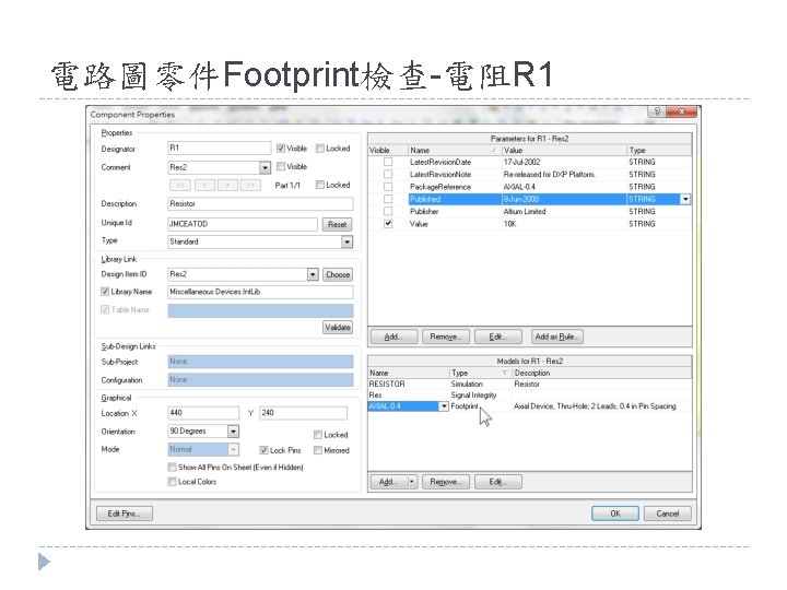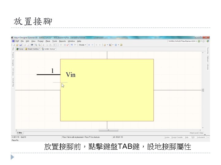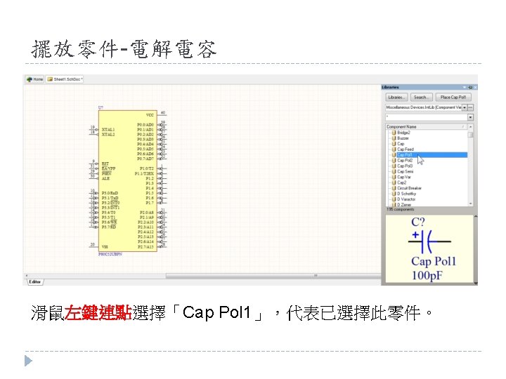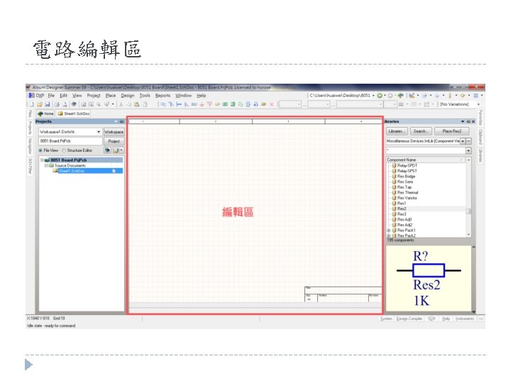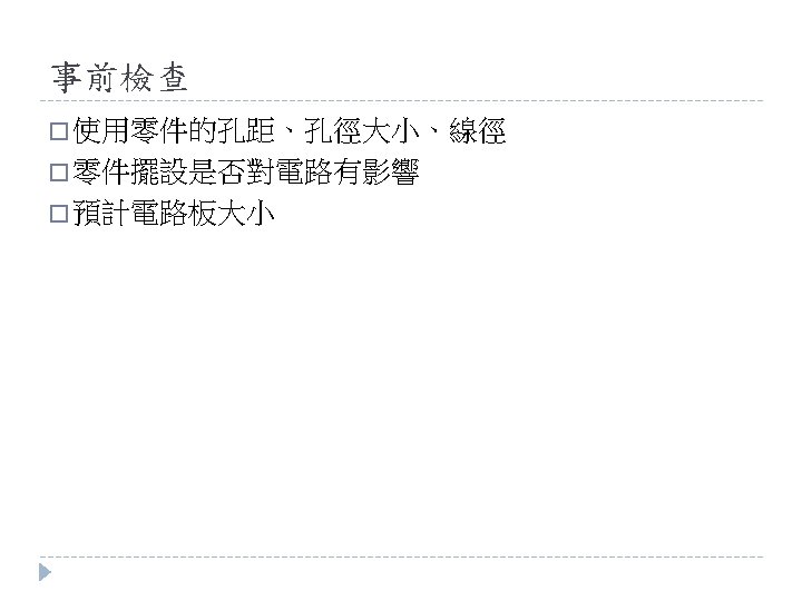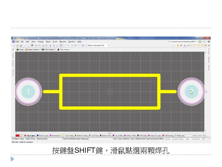 Altium Designer Summer 09 Altium Designer 1985 Protel Slides: 106 Download presentation Altium Designer Summer 09 Altium Designer歷史 � 1985年 Protel軟體誕生 � 2004年 Protel 2004 � 2005年 Altium Designer 6 � 2008年 Altium Designer Summer 08 � 2008年 Altium Designer Winter 09 � 2009年 Altium Designer Summer 09 � 2011年 Altium Designer 10 專案檔. Prj. Pcb建立 路徑:File→New→Project →PCB Project Projects面板區裡出現一個「PCB_Project 1. Prj. Pcb」專案 建立電路圖. Sch. Doc檔 路徑:File→New →Schematic 選擇零件 40 -PIN IC腳座 � Miscellaneous Devices. Int. Lib和Miscellaneous Connectors. Int. Lib兩個零件庫中並沒有40 -PIN IC腳座, 需使用搜尋功能。 零件搜尋 1. Operator欄位選擇contains 2. Value欄位輸入 80 c 52 3. Scope欄位點選Available libraries 4. 點選Search 建立零件庫 路徑:File→New →Library→Schematic Library 繪製PCB Layout圖 電路圖零件Footprint檢查-電阻R 1 對電阻R 1連擊,出現Component Properties對話框 電路圖零件Footprint檢查-穩壓IC VR 1 對穩壓IC連擊,出現Component Properties對話框 PCB Layout圖存檔. Pcb. Doc PCB Layout編輯環境 轉出電路圖至PCB Layout圖 路徑:Design→Update PCB Document PCB 1. Pcb. Doc 轉出電路圖至PCB Layout圖 點選Execute Changes檢查,匯入PCB Layout圖 設定線徑大小 路徑:Design→Routing→Width 設定孔徑大小 路徑:Designs→Make PCB Library PCB Layout 具 完成PCB Layout圖 輸出PCB Layout圖 路徑:File→Fabrication Outputs →Final