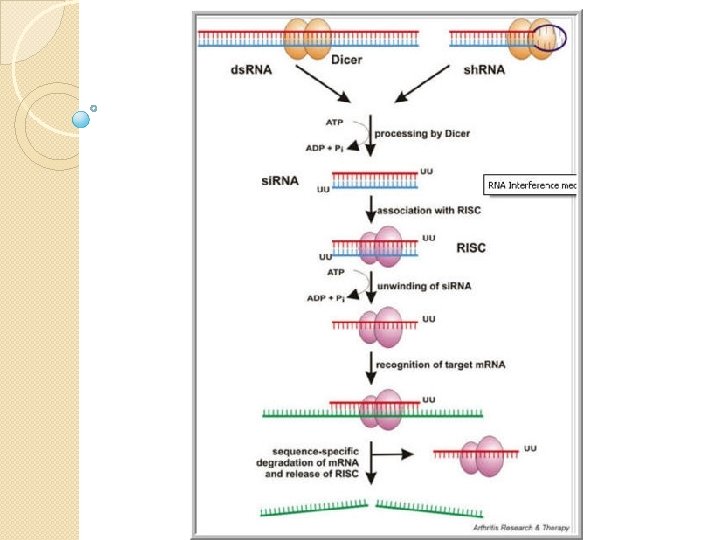 RNA-interferentie (RNAi) Animatie 1 Animatie 2 (eenvoudig) - ds. RNA wordt geknipt en gebonden door het enzym Dicer - 1 streng RNA wordt gekoppeld aan een eiwit en vormt RISC (RNA Induced Silencing Complex) (de andere streng RNA wordt afgebroken) - RISC koppelt de RNA-streng aan een complementair stuk m. RNA - dit m. RNA wordt dan geknipt en afgebroken - het gen is geïnactiveerd
