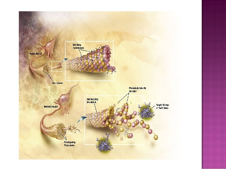 Amyloid Precursor Protein Alzheimer's disease has been identified as a protein misfolding disease (proteopathy), caused by accumulation of abnormally folded A-beta and tau proteins in the brain. Plaques are made up of small peptides, 39– 43 amino acids in length, called beta-amyloid (also written as A-beta or Aβ). Beta-amyloid is a fragment from a larger protein called amyloid precursor protein (APP), a transmembrane protein that penetrates through the neuron's membrane. APP is critical to neuron growth, survival and post-injury repair. In Alzheimer's disease, an unknown process causes APP to be divided into smaller fragments by enzymes through proteolysis. One of these fragments gives rise to fibrils of beta-amyloid, which form clumps that deposit outside neurons in dense formations known as senile plaques. AD is also considered a tauopathy due to abnormal aggregation of the tau protein. Every neuron has a cytoskeleton, an internal support structure partly made up of structures called microtubules. These microtubules act like tracks, guiding nutrients and molecules from the body of the cell to the ends of the axon and back. A protein called tau stabilizes the microtubules when phosphorylated, and is therefore called a microtubule-associated protein. In AD, tau undergoes chemical changes, becoming hyperphosphorylated; it then begins to pair with other threads, creating neurofibrillary tangles and disintegrating the neuron's transport system.