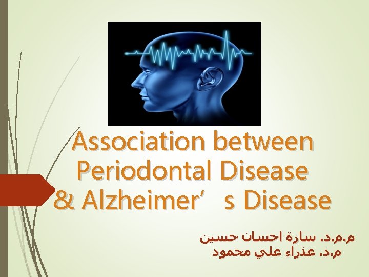 Conclusion v Bacterial & viral infections commonly found in PD may impact the brain, either directly by harmful pathogens products that contribute to the development of AD. v or via systemic inflammatory responses that contribute to the exacerbation of existing brain diseases. v Periodontal infections may also contribute to vascular pathology with the potential to impact brain function. v PDD & AD may also share common risk factors such as: genetic polymorphisms inflammatory mediators Age Gender Lifestyle