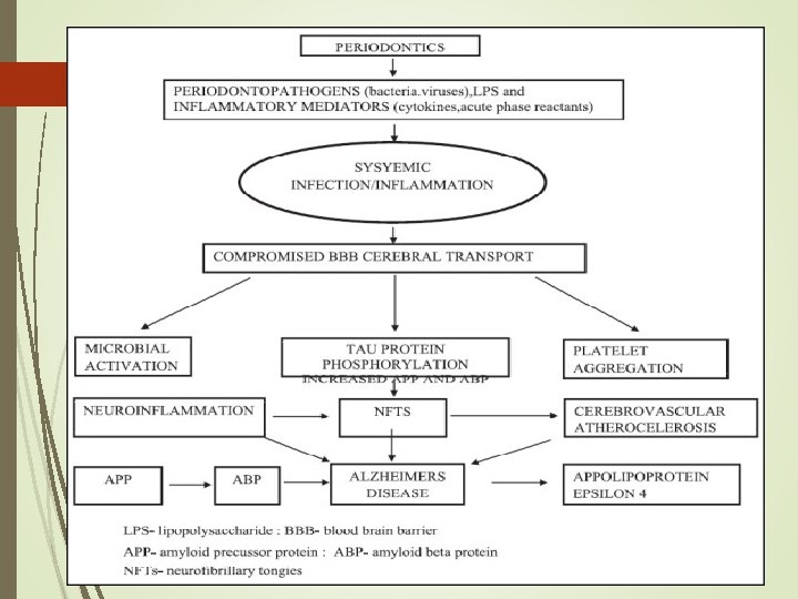 1 -Pathogen Products v The role of periodontal pathogens in pathogenesis of AD. v A study showed the presence of LPS of P. gingivalis in brains of an individual with AD. [Poole et al, 2013] v Elevated plasma AB Ig. G to periodontal bacteria (A. a, P. gingivalis, or/& T. forsythia) found in individual with AD compared to normal controls. [Sparks et al, 2012] v Furthermore, elevated serum AB Ig. G to F. nucleatum & P. intermedia in subjects with AD had found before development of AD as compared to controls. [Kamer et al, 2009] v Animal studies show that chronic infusion of LPS into rat brains may result in long lasting inflammatory reaction with pathological changes. These changes include an increase in IL-1β, TNF-α & βAPP & the degeneration of neurons, impairment in working memory, & decreased size of hippocampus & temporal lobe. [Hauss. Wegrzyniak et al, 2000]