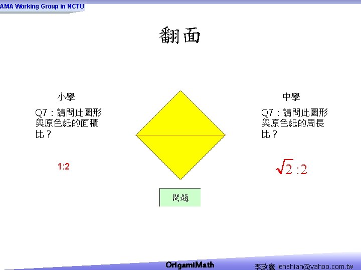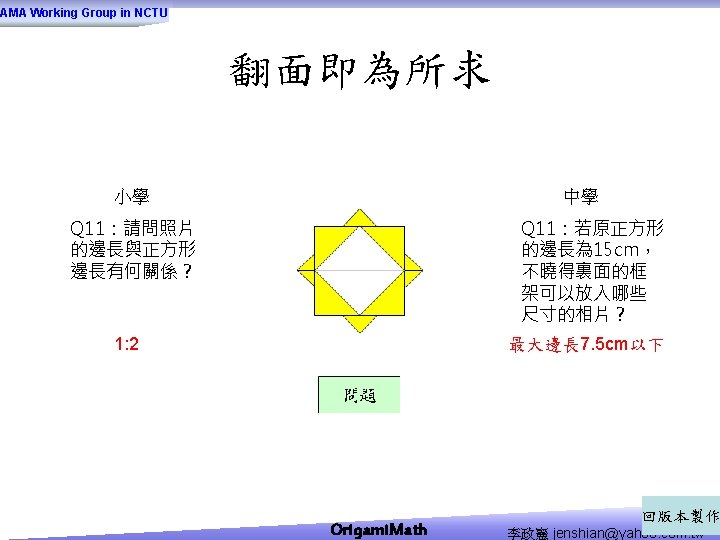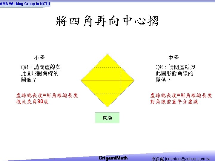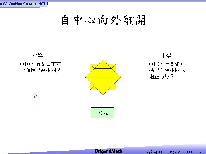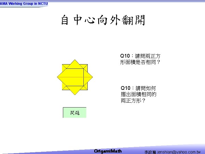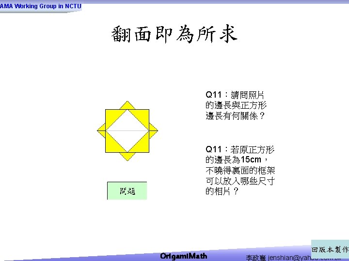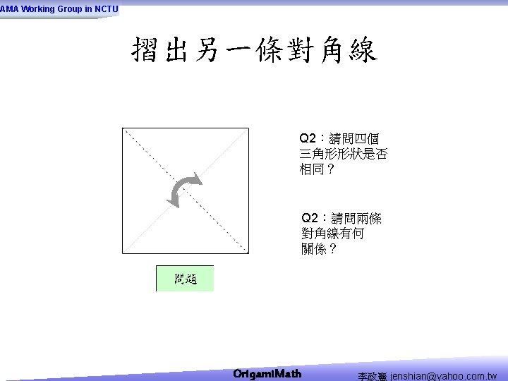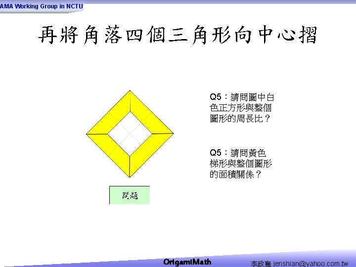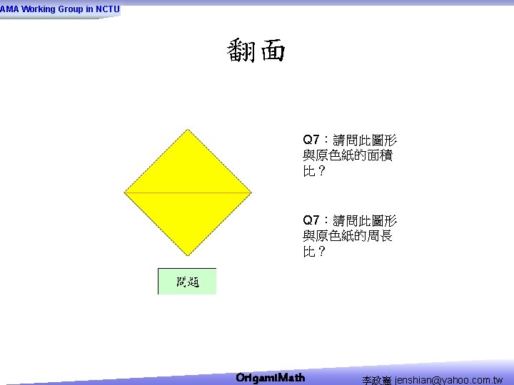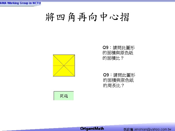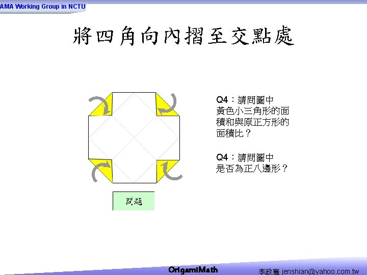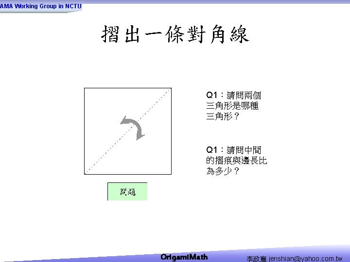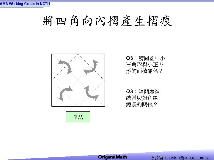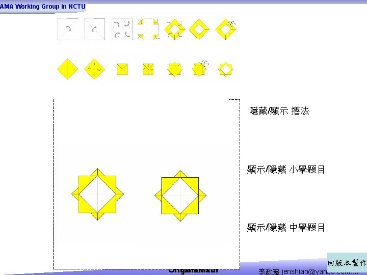 AMA Working Group in NCTU Origami Math jenshianyahoo Slides: 50 Download presentation AMA Working Group in NCTU Origami. Math 李政憲 jenshian@yahoo. com. tw AMA Working Group in NCTU Origami. Math 李政憲 jenshian@yahoo. com. tw AMA Working Group in NCTU Origami. Math 李政憲 jenshian@yahoo. com. tw AMA Working Group in NCTU Origami. Math 李政憲 jenshian@yahoo. com. tw AMA Working Group in NCTU Origami. Math 李政憲 jenshian@yahoo. com. tw AMA Working Group in NCTU Origami. Math 李政憲 jenshian@yahoo. com. tw AMA Working Group in NCTU Origami. Math 李政憲 jenshian@yahoo. com. tw AMA Working Group in NCTU Origami. Math 李政憲 jenshian@yahoo. com. tw AMA Working Group in NCTU Origami. Math 李政憲 jenshian@yahoo. com. tw AMA Working Group in NCTU Origami. Math 李政憲 jenshian@yahoo. com. tw AMA Working Group in NCTU Origami. Math 回版本製作 李政憲 jenshian@yahoo. com. tw AMA Working Group in NCTU 自中心向外翻開 Origami. Math 李政憲 jenshian@yahoo. com. tw AMA Working Group in NCTU Origami. Math 回版本製作 李政憲 jenshian@yahoo. com. tw AMA Working Group in NCTU 再將角落四個三角形向中心摺 Origami. Math 李政憲 jenshian@yahoo. com. tw AMA Working Group in NCTU 將四角再向中心摺 Q 8:請問虛線與 此圖形對角線的 關係? Origami. Math 李政憲 jenshian@yahoo. com. tw AMA Working Group in NCTU 自中心向外翻開 Origami. Math 李政憲 jenshian@yahoo. com. tw AMA Working Group in NCTU 翻面即為所求 Origami. Math 李政憲 jenshian@yahoo. com. tw AMA Working Group in NCTU 1. 2. 3. 4. 5. 6. 7. 8. 9. 10. 11. 12. 顯示/隱藏 小學題目 關/開摺法 Origami. Math 顯示/隱藏 中學題目 回版本製作 李政憲 jenshian@yahoo. com. tw AMA Working Group in NCTU 參考網站: • http: //www. en. origami-club. com/ Origami. Math 李政憲 jenshian@yahoo. com. tw