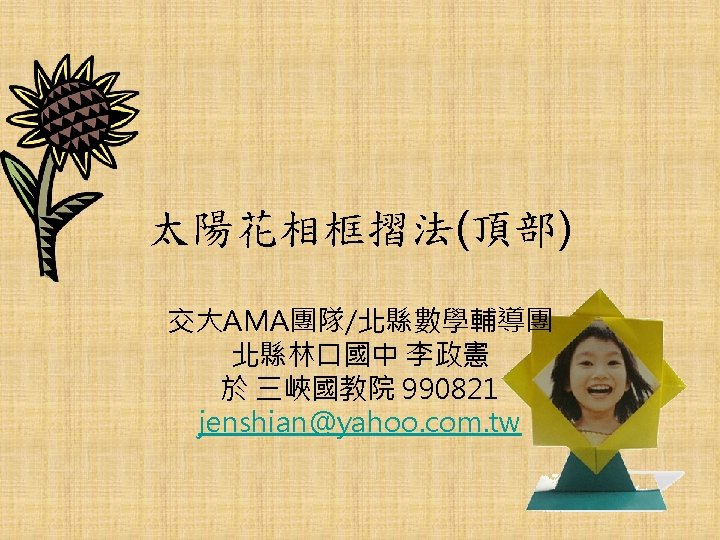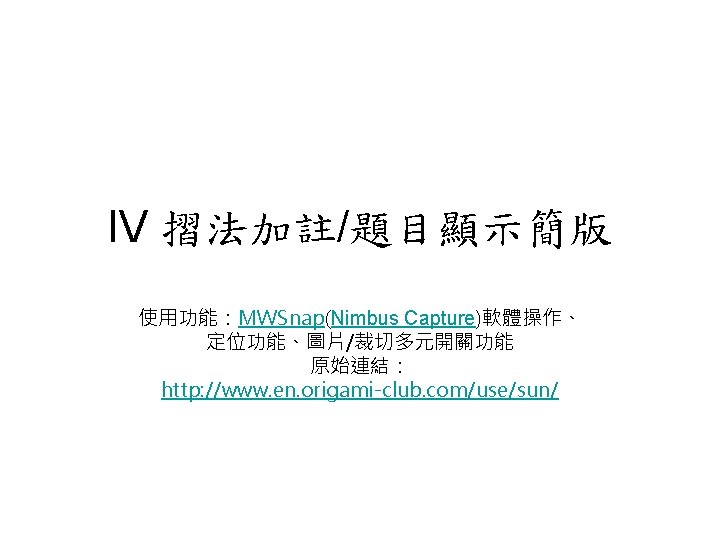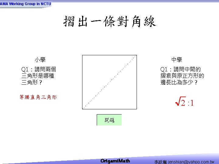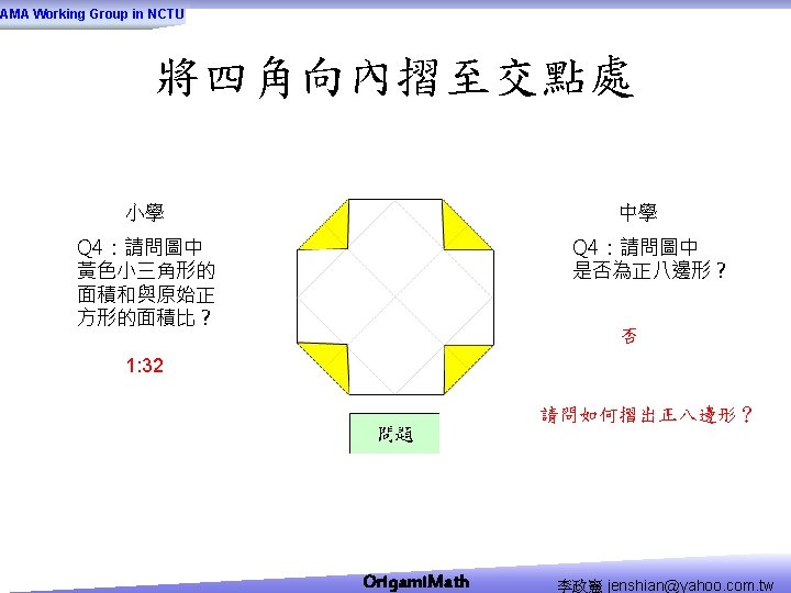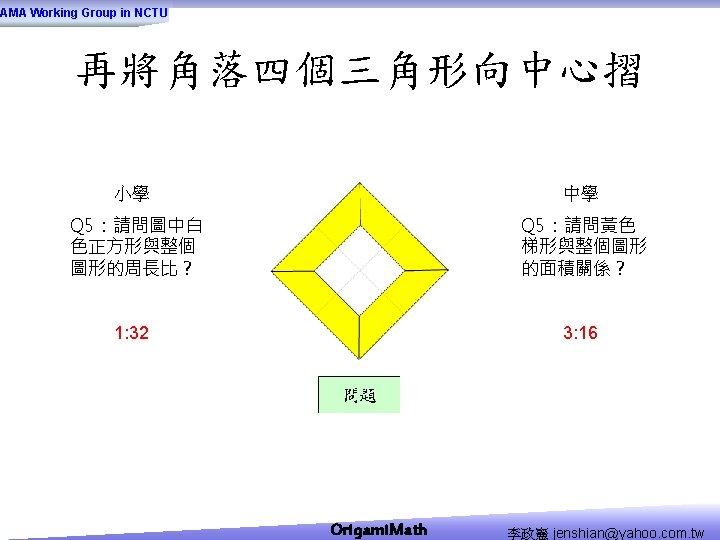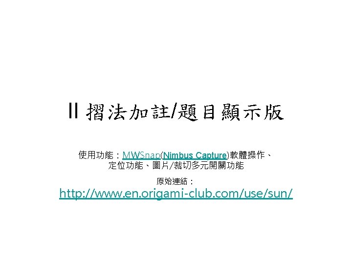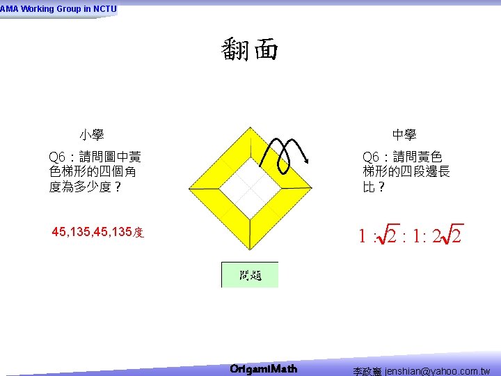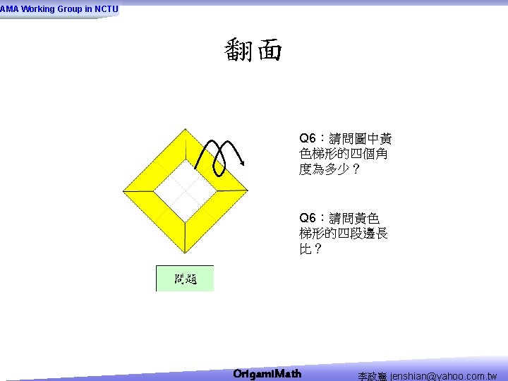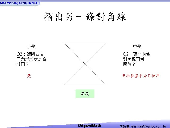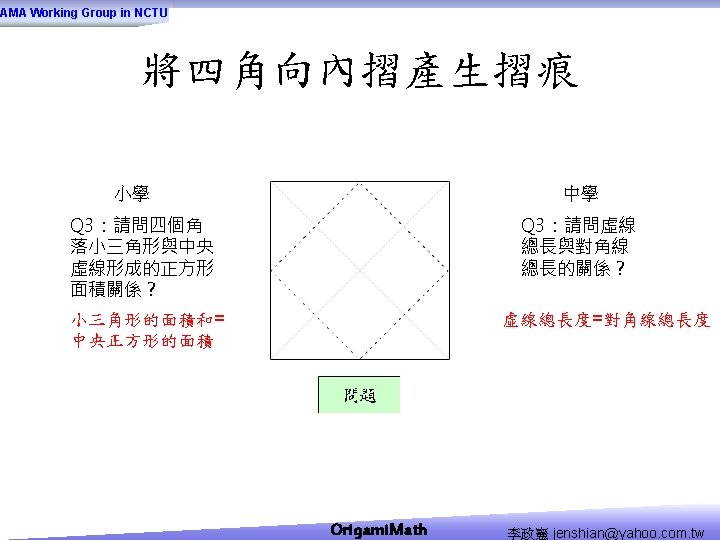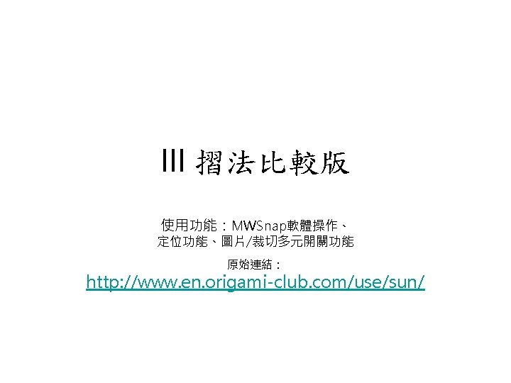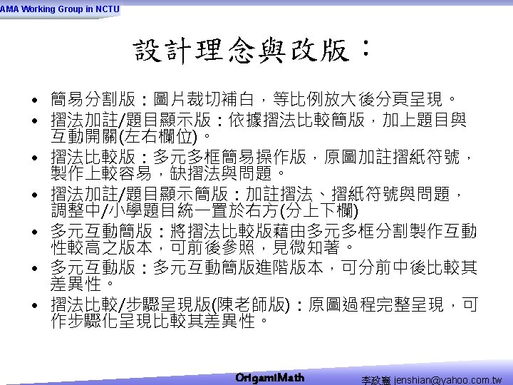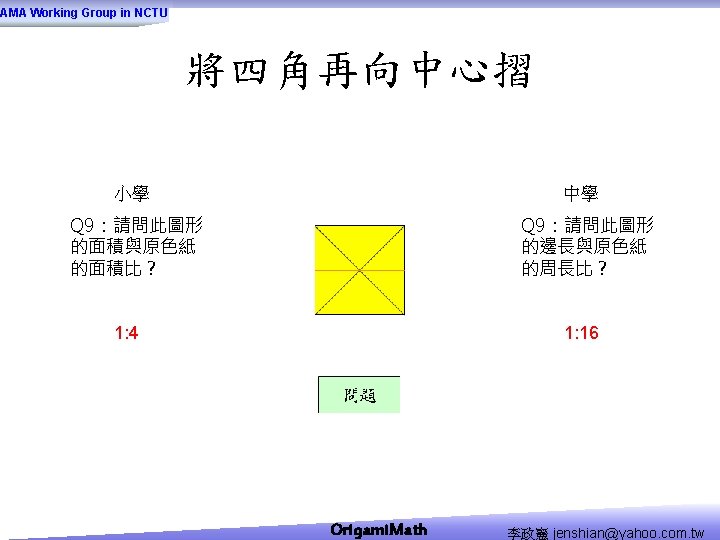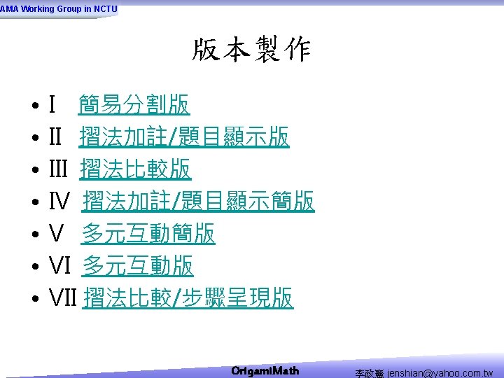 AMA Working Group in NCTU Origami Math jenshianyahoo Slides: 50 Download presentation AMA Working Group in NCTU Origami. Math 李政憲 jenshian@yahoo. com. tw AMA Working Group in NCTU Origami. Math 李政憲 jenshian@yahoo. com. tw AMA Working Group in NCTU Origami. Math 李政憲 jenshian@yahoo. com. tw AMA Working Group in NCTU Origami. Math 李政憲 jenshian@yahoo. com. tw AMA Working Group in NCTU Origami. Math 李政憲 jenshian@yahoo. com. tw AMA Working Group in NCTU Origami. Math 李政憲 jenshian@yahoo. com. tw AMA Working Group in NCTU Origami. Math 李政憲 jenshian@yahoo. com. tw AMA Working Group in NCTU Origami. Math 李政憲 jenshian@yahoo. com. tw AMA Working Group in NCTU Origami. Math 李政憲 jenshian@yahoo. com. tw AMA Working Group in NCTU Origami. Math 李政憲 jenshian@yahoo. com. tw AMA Working Group in NCTU Origami. Math 回版本製作 李政憲 jenshian@yahoo. com. tw AMA Working Group in NCTU 自中心向外翻開 Origami. Math 李政憲 jenshian@yahoo. com. tw AMA Working Group in NCTU Origami. Math 回版本製作 李政憲 jenshian@yahoo. com. tw AMA Working Group in NCTU 再將角落四個三角形向中心摺 Origami. Math 李政憲 jenshian@yahoo. com. tw AMA Working Group in NCTU 將四角再向中心摺 Q 8:請問虛線與 此圖形對角線的 關係? Origami. Math 李政憲 jenshian@yahoo. com. tw AMA Working Group in NCTU 自中心向外翻開 Origami. Math 李政憲 jenshian@yahoo. com. tw AMA Working Group in NCTU 翻面即為所求 Origami. Math 李政憲 jenshian@yahoo. com. tw AMA Working Group in NCTU 1. 2. 3. 4. 5. 6. 7. 8. 9. 10. 11. 12. 顯示/隱藏 小學題目 關/開摺法 Origami. Math 顯示/隱藏 中學題目 回版本製作 李政憲 jenshian@yahoo. com. tw AMA Working Group in NCTU 參考網站: • http: //www. en. origami-club. com/ Origami. Math 李政憲 jenshian@yahoo. com. tw