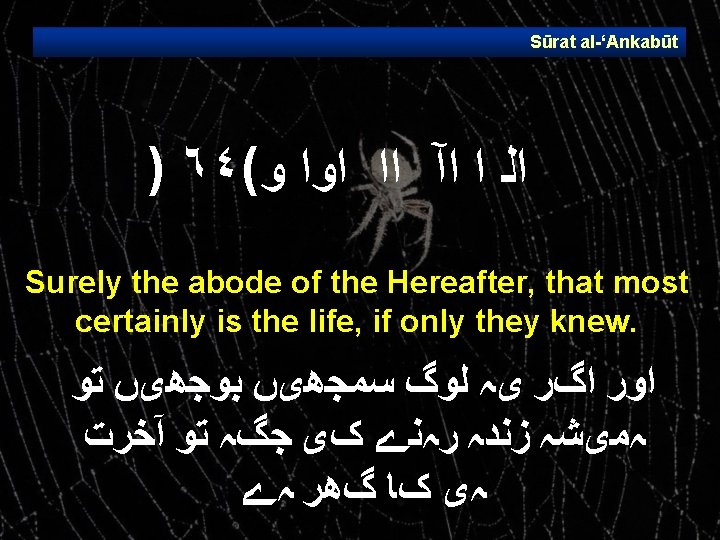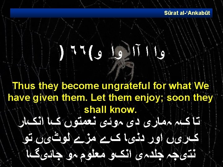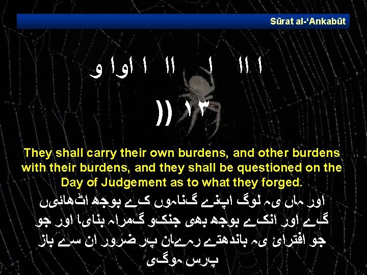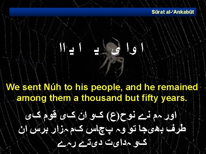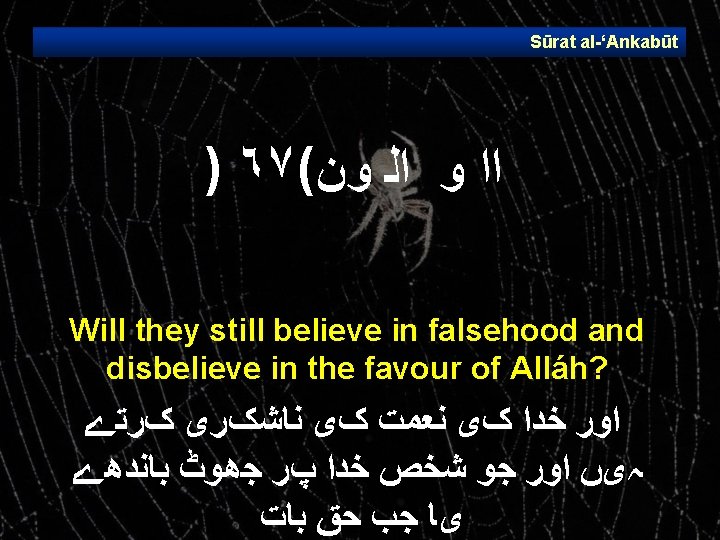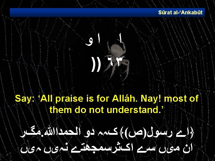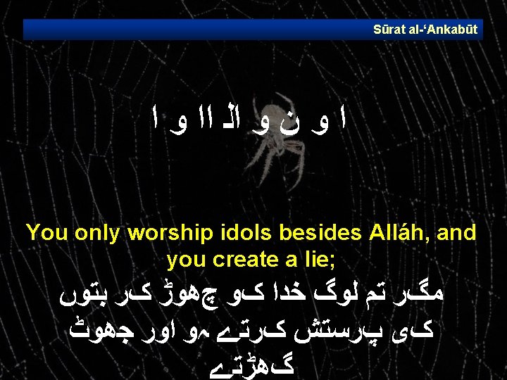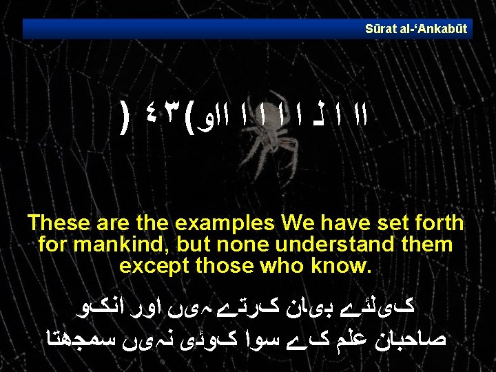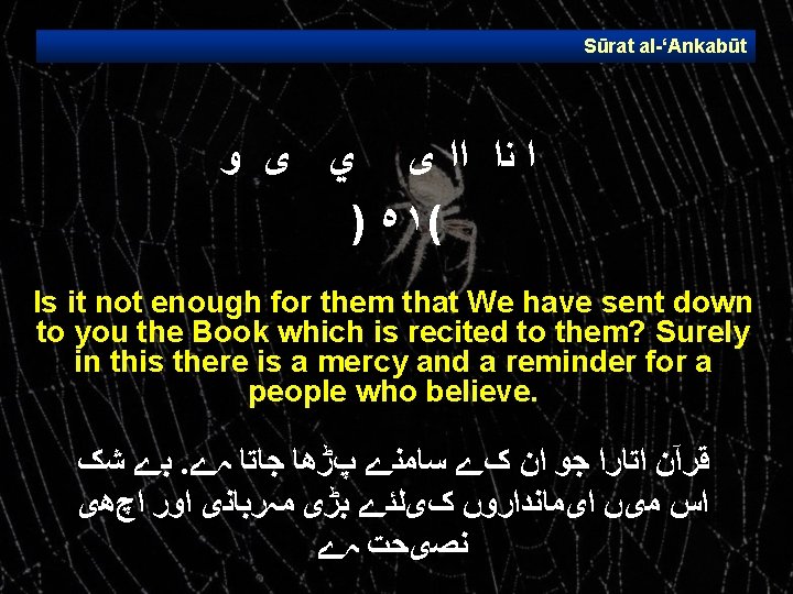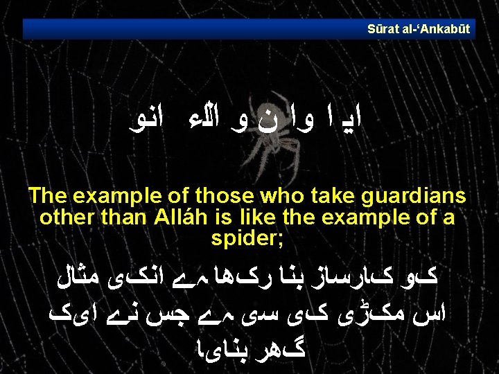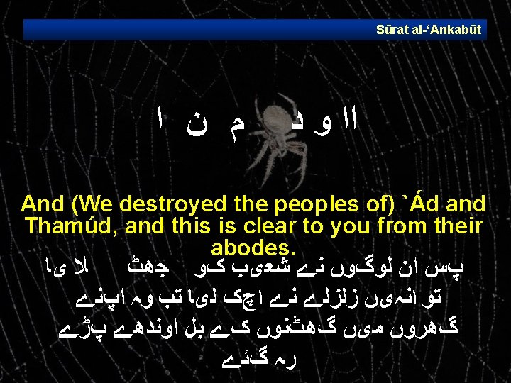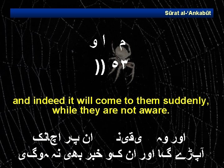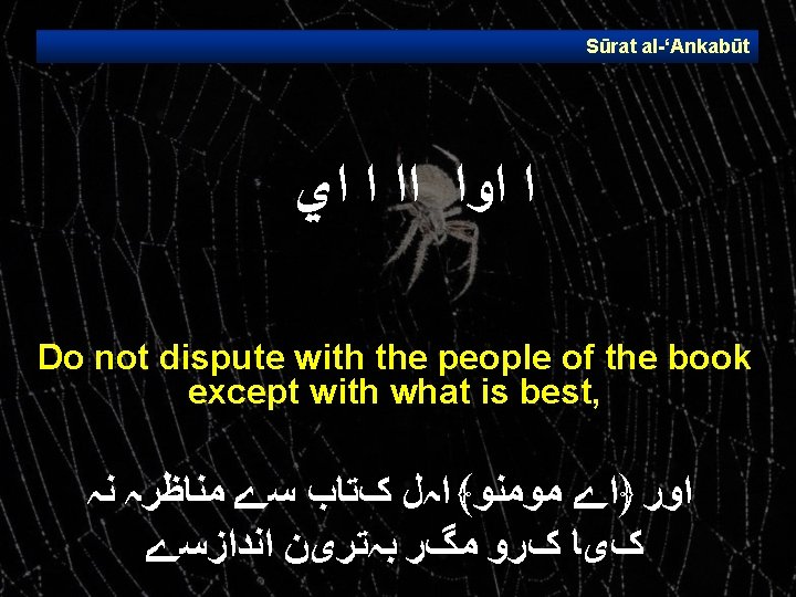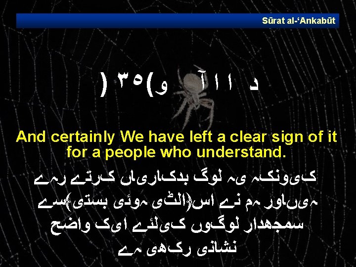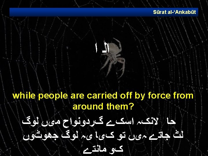 Sūrat al ‘Ankabūt ) ٤١( ﺍﻭ ﺍﻨﻭ ﺍﻭﺍ ﻭ ﺍ ﺍ it takes a house, but surely the frailest of houses is the house of a spider; if only they knew. ﺳﻤﺠھﺘے ﺑھی ہﻮں