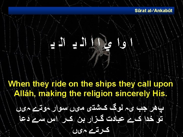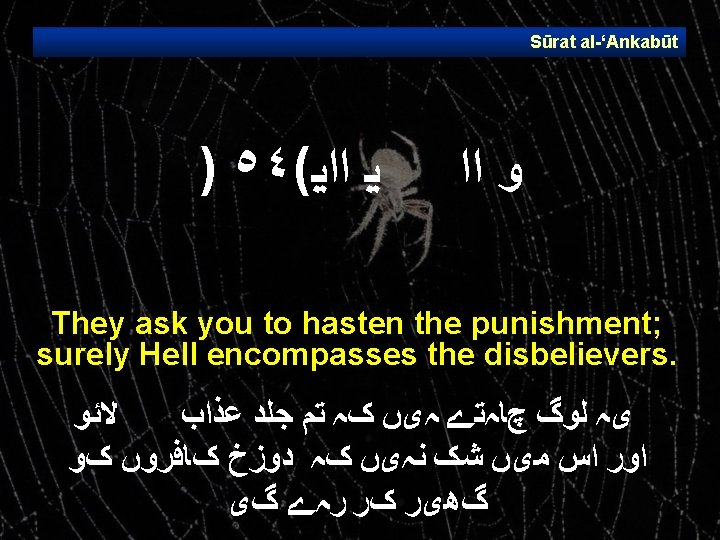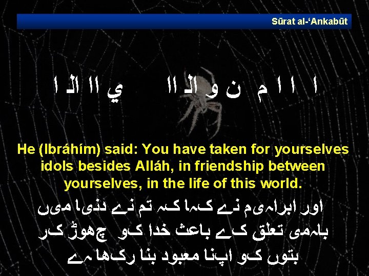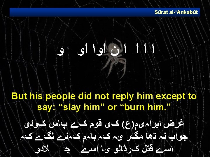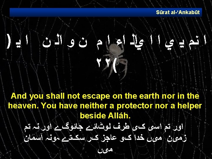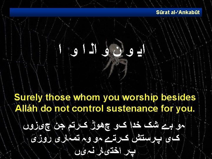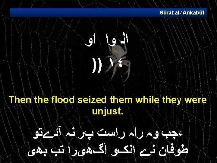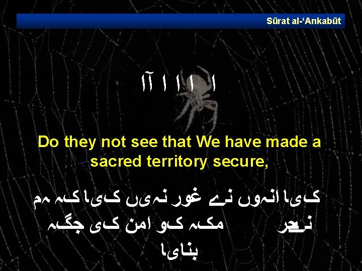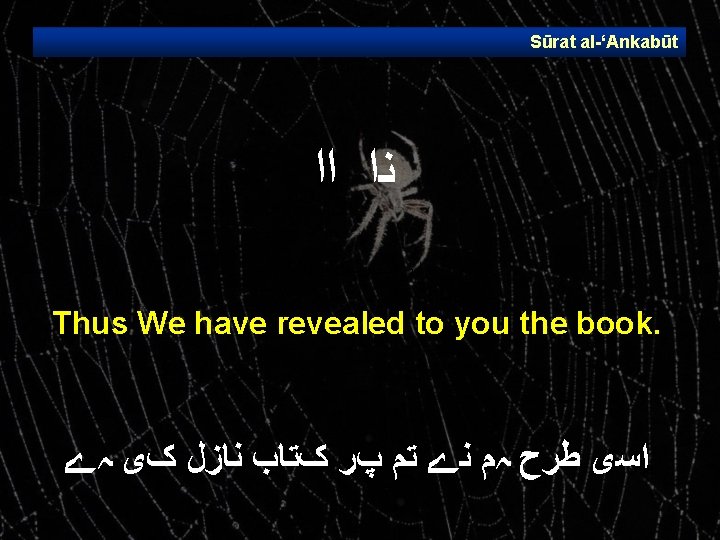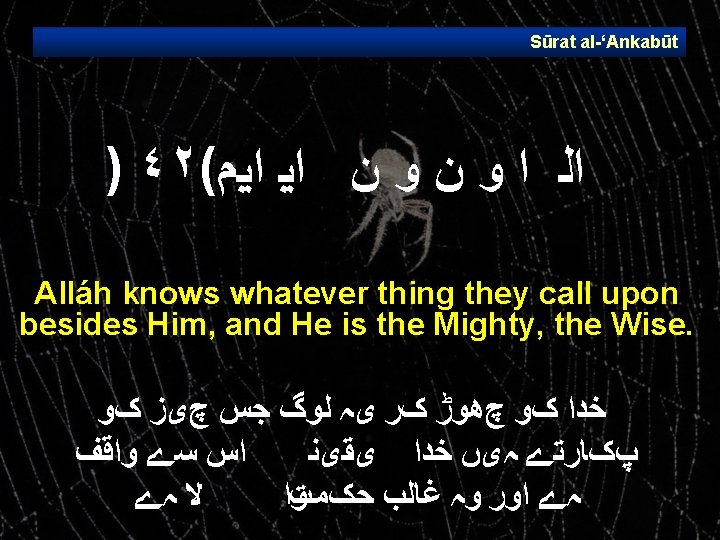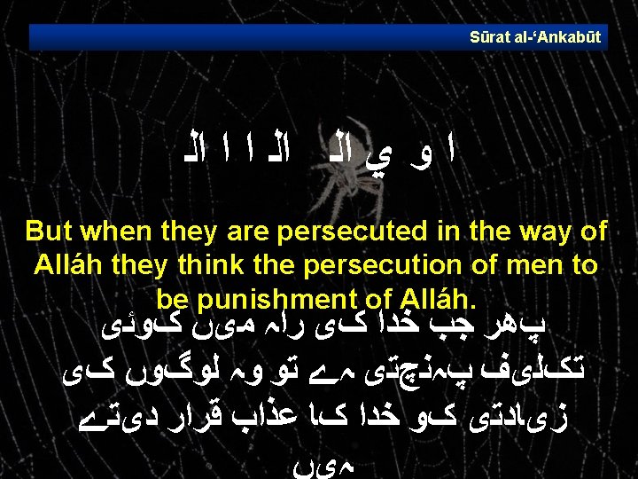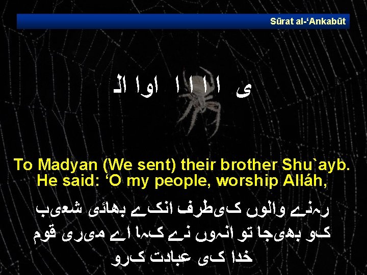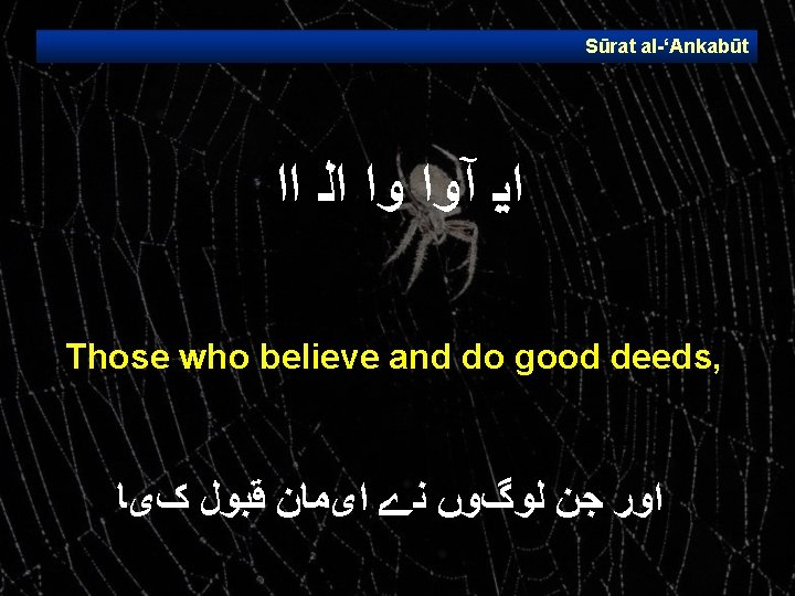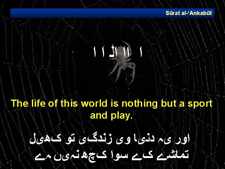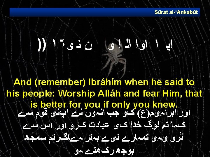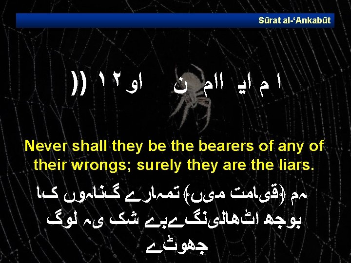 Sūrat al ‘Ankabūt ) ٤١( ﺍﻭ ﺍﻨﻭ ﺍﻭﺍ ﻭ ﺍ ﺍ it takes a house, but surely the frailest of houses is the house of a spider; if only they knew. ﺳﻤﺠھﺘے ﺑھی ہﻮں