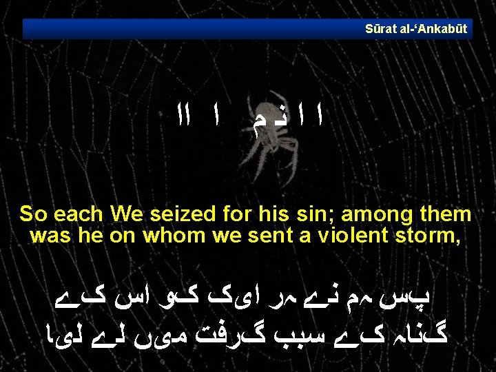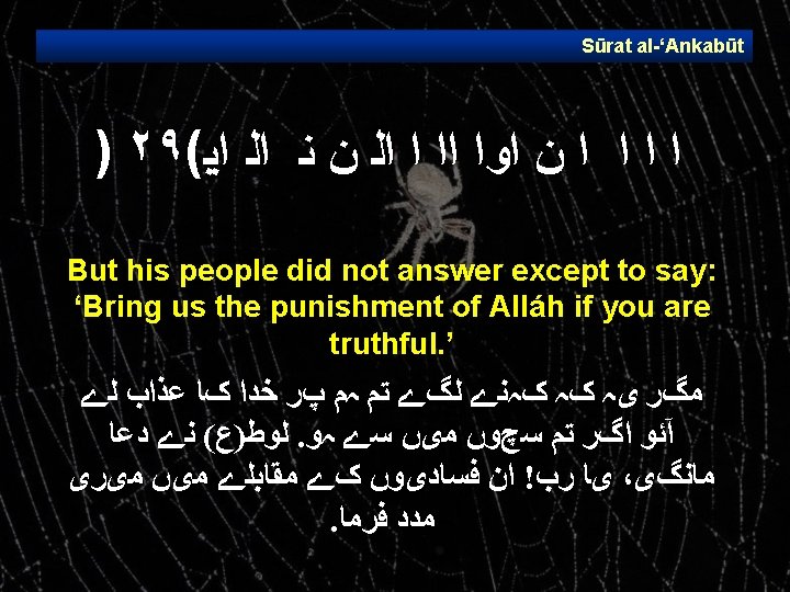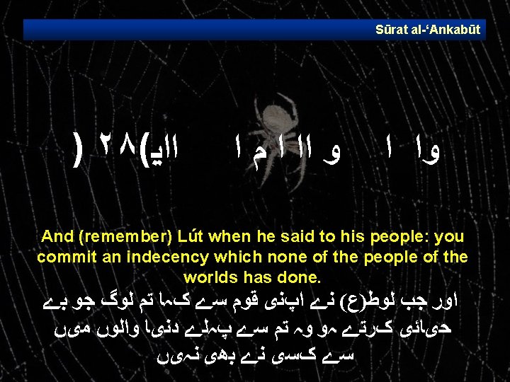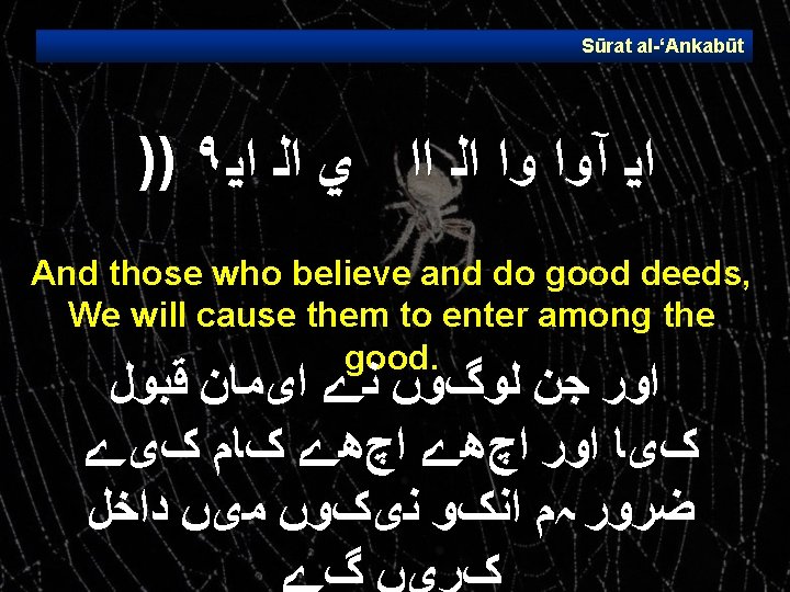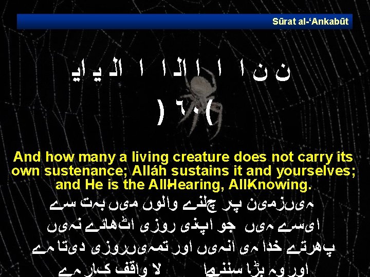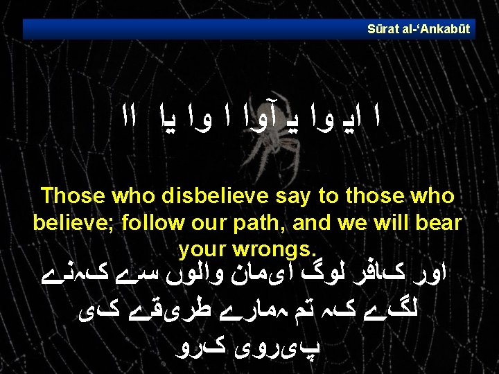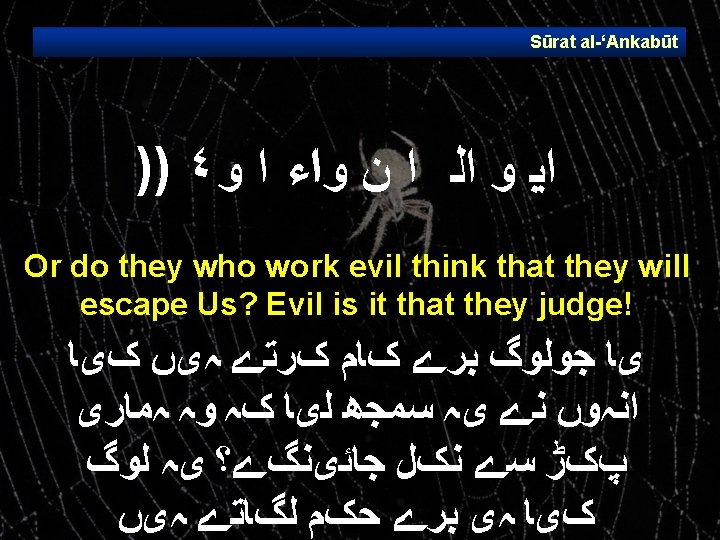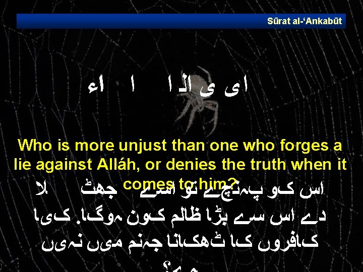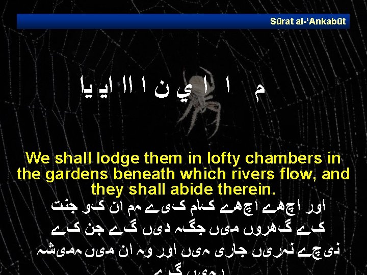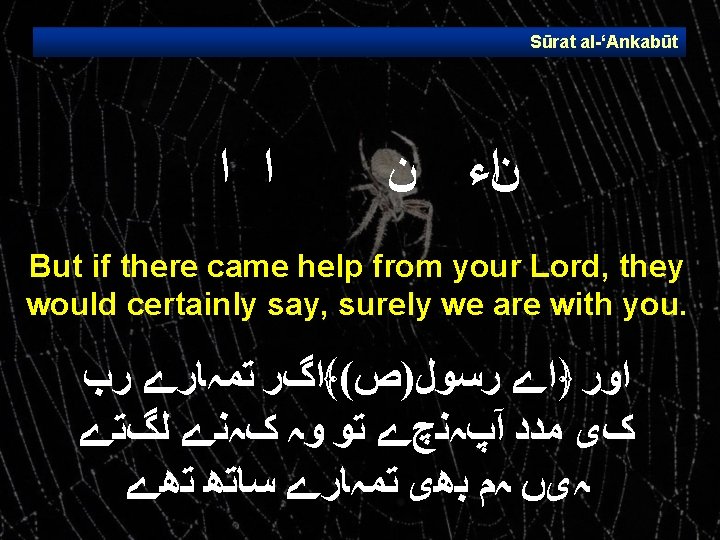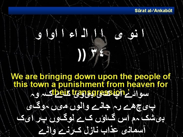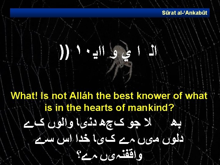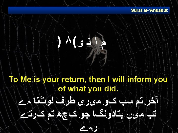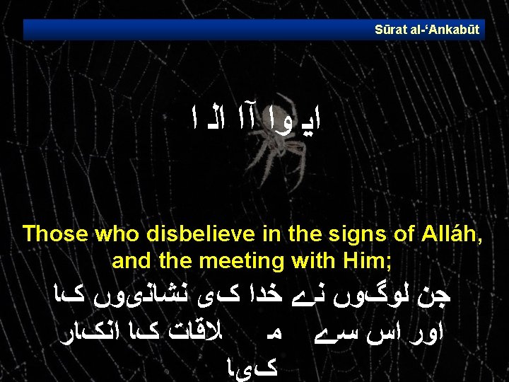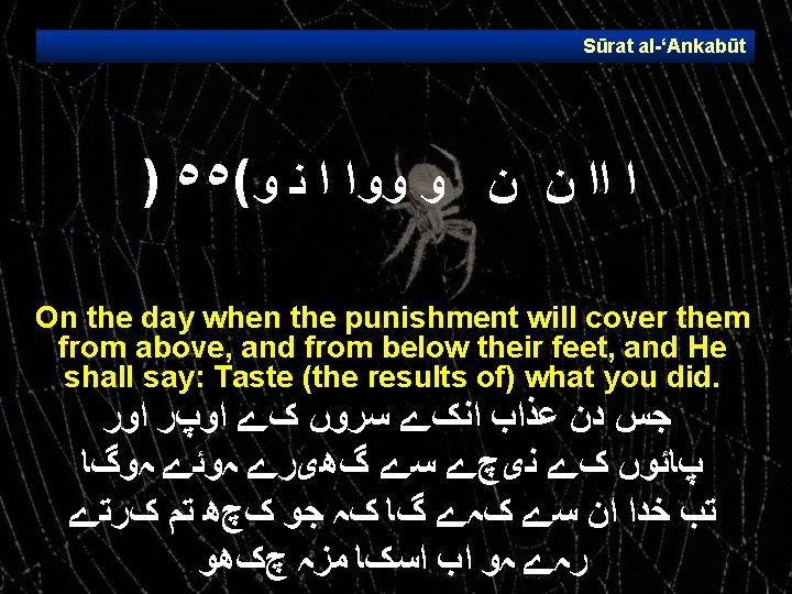 Sūrat al ‘Ankabūt ) ٤١( ﺍﻭ ﺍﻨﻭ ﺍﻭﺍ ﻭ ﺍ ﺍ it takes a house, but surely the frailest of houses is the house of a spider; if only they knew. ﺳﻤﺠھﺘے ﺑھی ہﻮں
