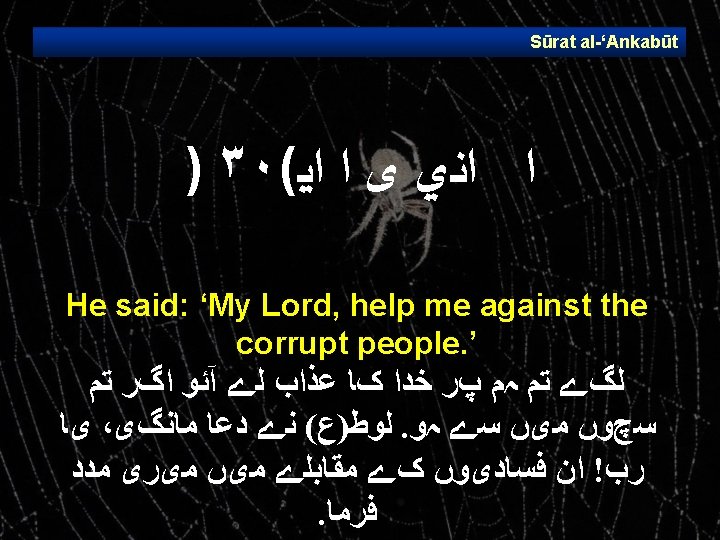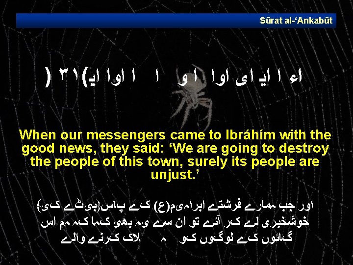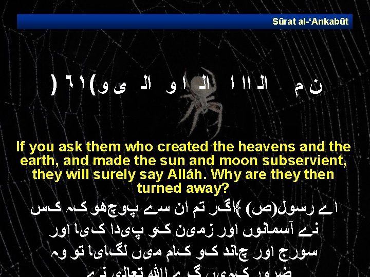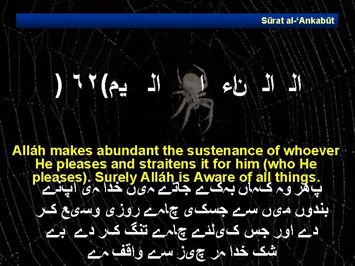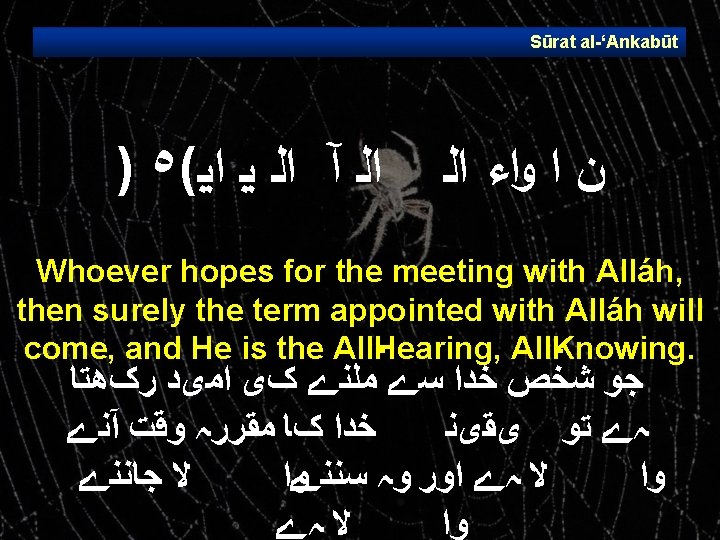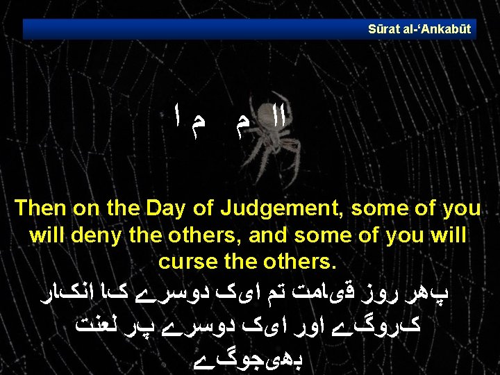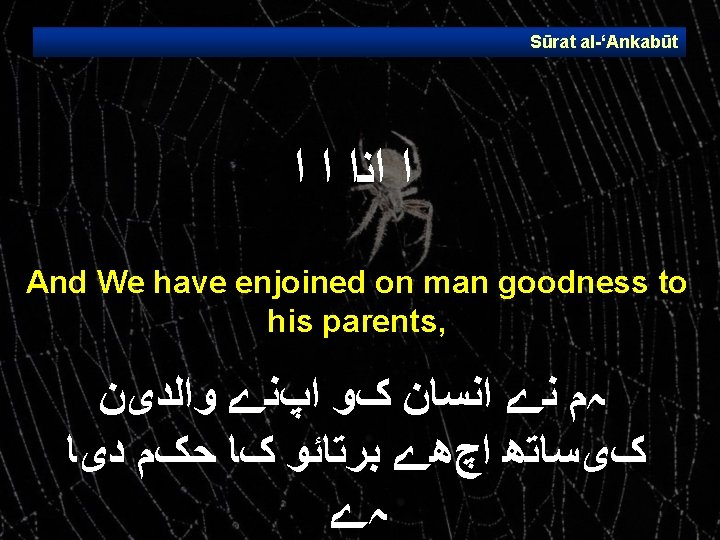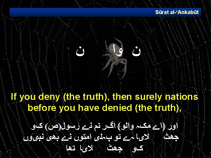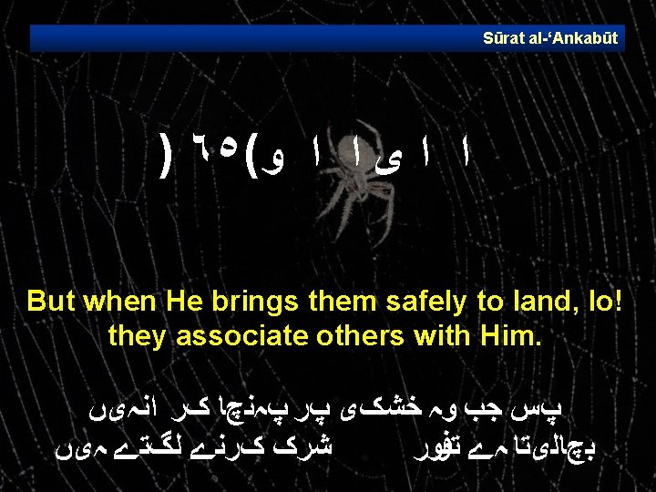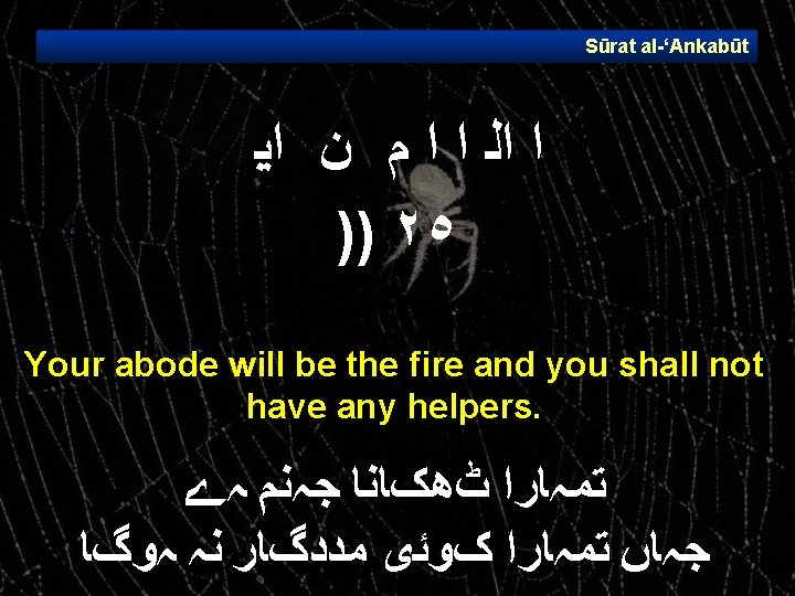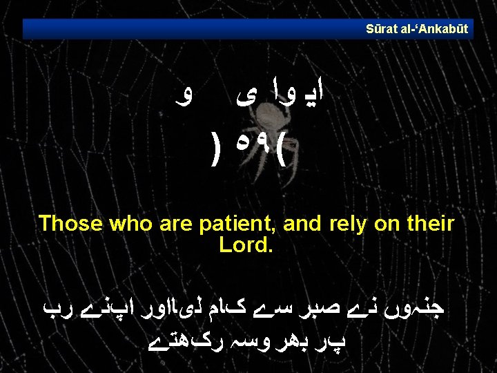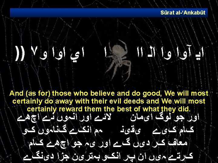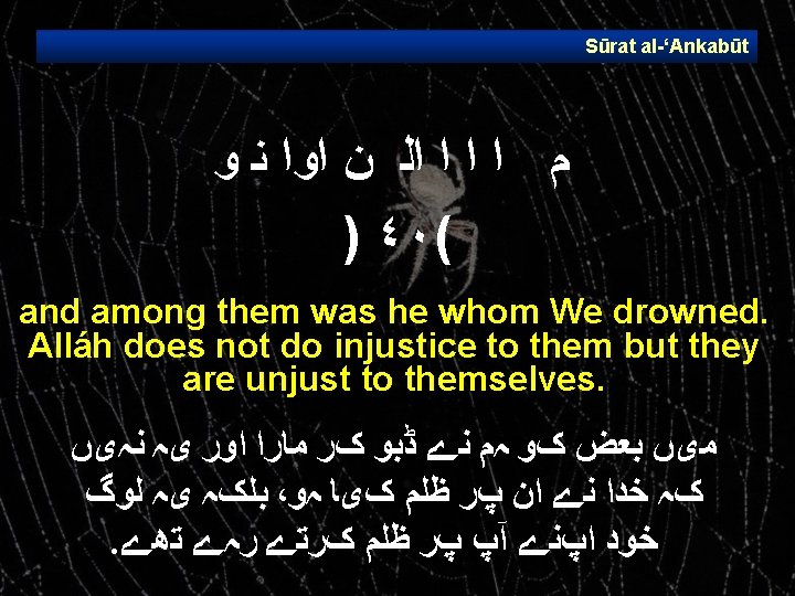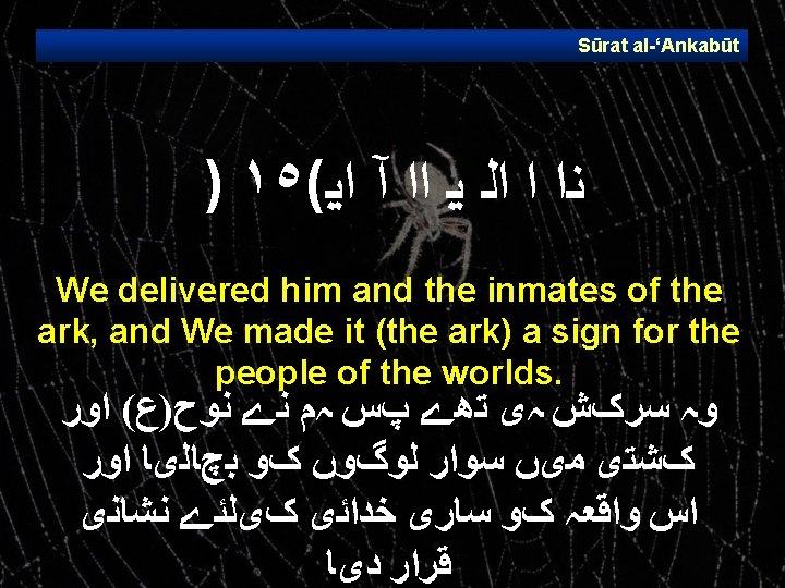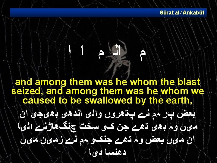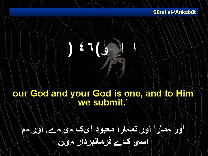 Sūrat al ‘Ankabūt ) ٤١( ﺍﻭ ﺍﻨﻭ ﺍﻭﺍ ﻭ ﺍ ﺍ it takes a house, but surely the frailest of houses is the house of a spider; if only they knew. ﺳﻤﺠھﺘے ﺑھی ہﻮں
