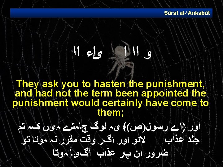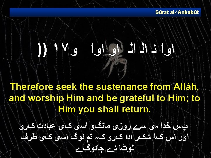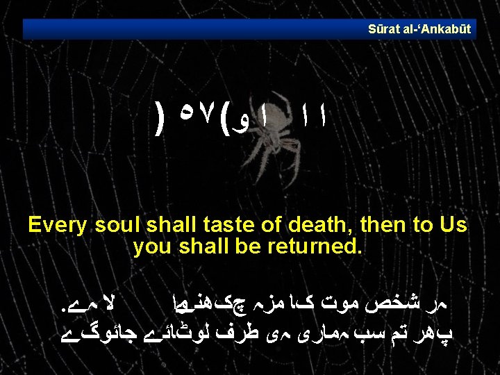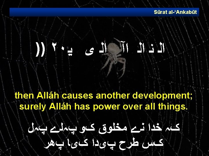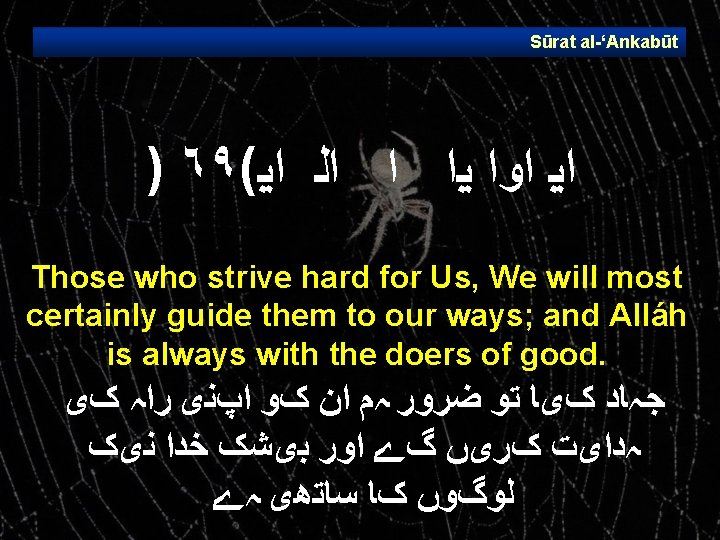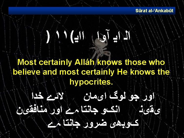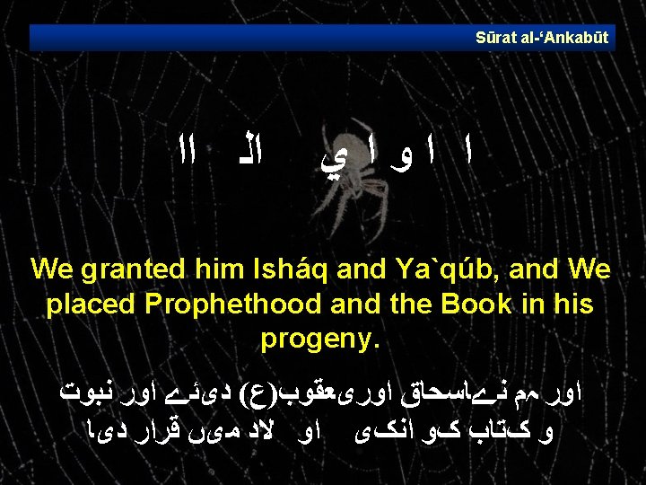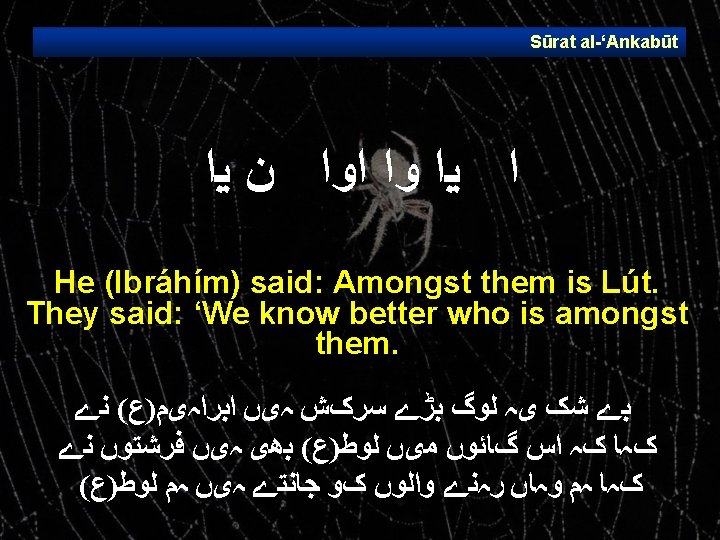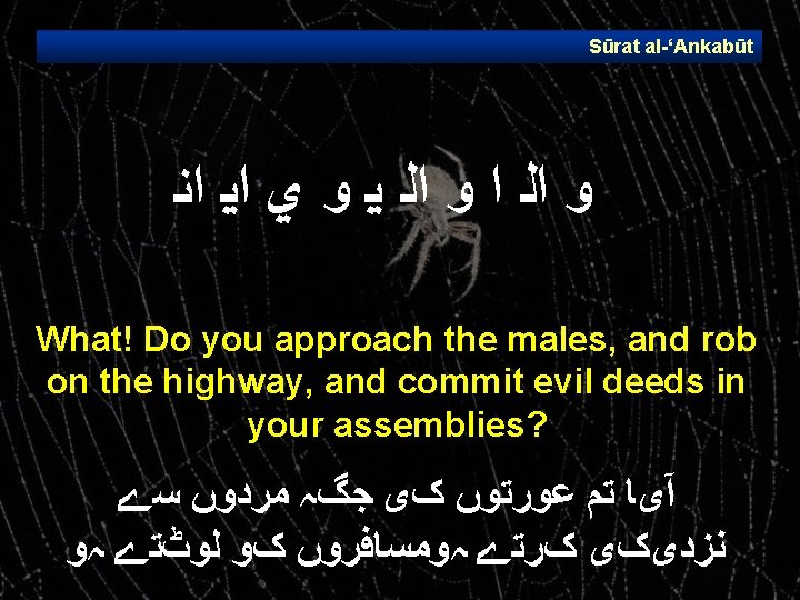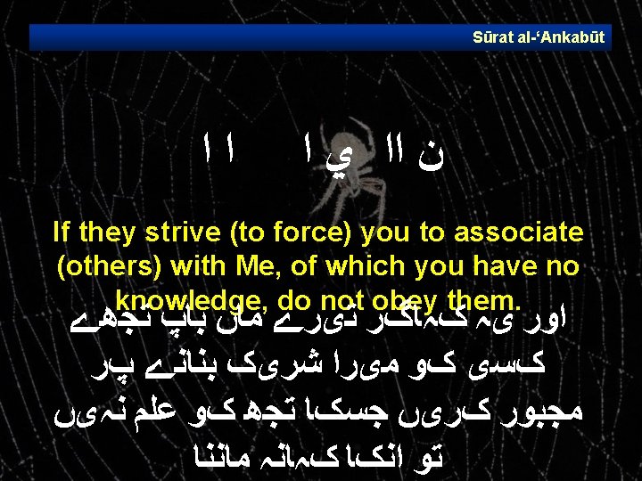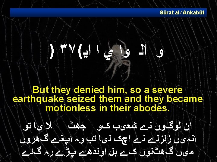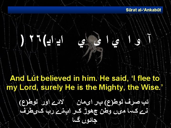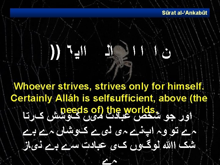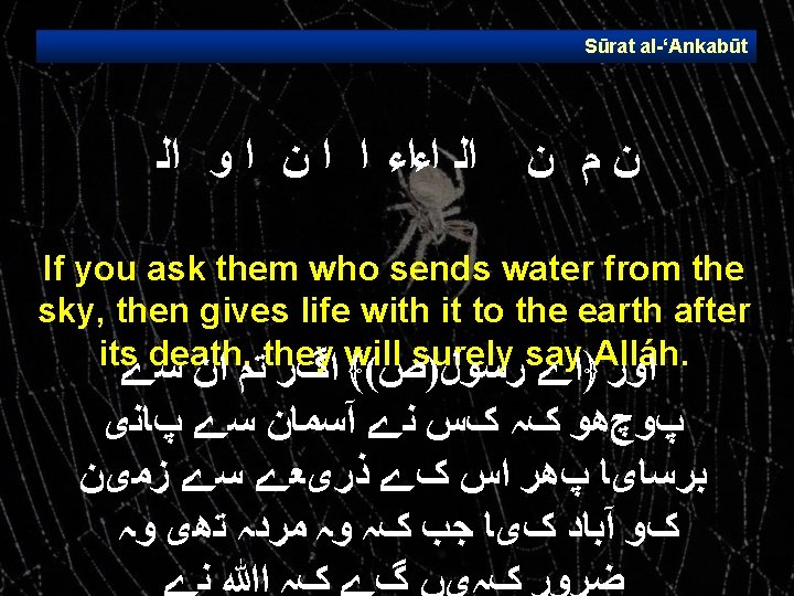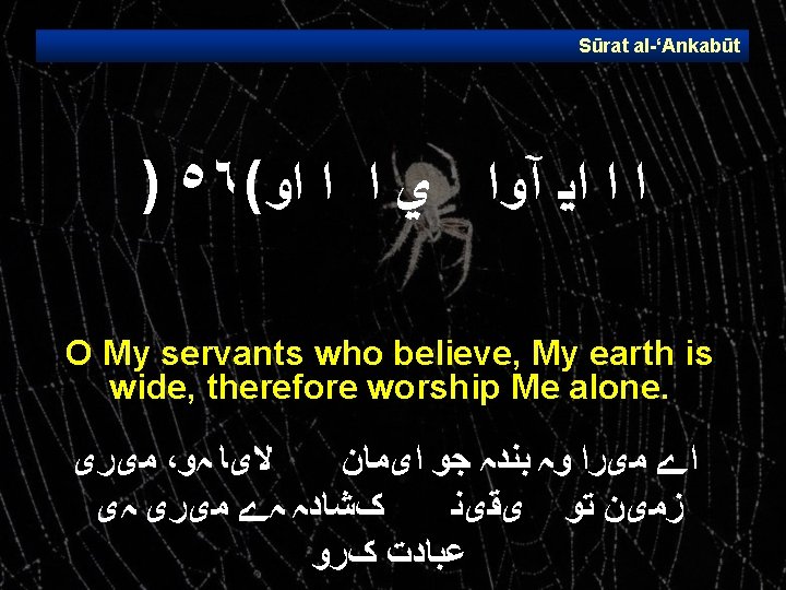Sūrat al ‘Ankabūt ) ٤١( ﺍﻭ ﺍﻨﻭ ﺍﻭﺍ ﻭ ﺍ ﺍ it takes a house, but surely the frailest of houses is the house of a spider; if only they knew. ﺳﻤﺠھﺘے ﺑھی ہﻮں