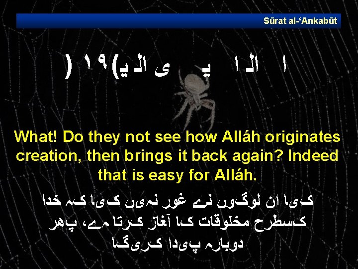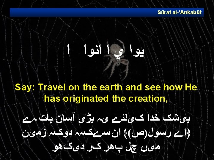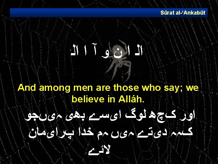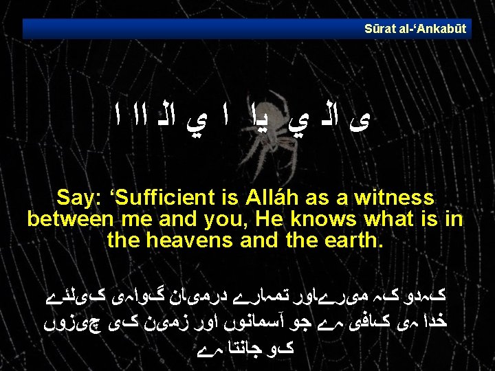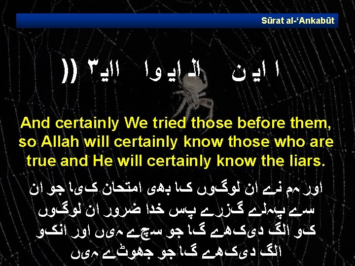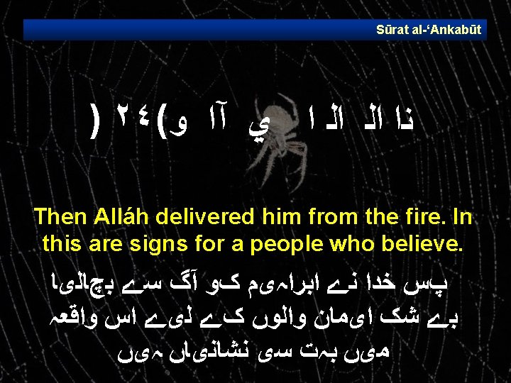 Sūrat al ‘Ankabūt ) ٤٤( ﻱ آ ﻳ ﺍﻟ ﺍﻟ ﺍﺍ ﺍ ﺍ Alláh created the heavens and the earth with truth, surely in this there is a sign for the believers. ﻧہیں کہ ﺍﺱ ﻣیں ﺍیﻤﺎﻧﺪﺍﺭﻭں ﻧﺸﺎﻧی ہے کیﻠﺌے ﺣﺘﻤ