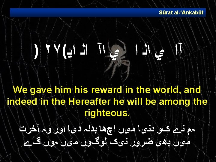 Sūrat al ‘Ankabūt ) ٥٨( ﺍﺍﻳﻦ How excellent is the reward of those who perform (good) deeds. ﻧیکﻮﻟﻮگﻮں کﺎ کیﺎ ﺧﻮﺏ ﺍﺟﺮ ہے
