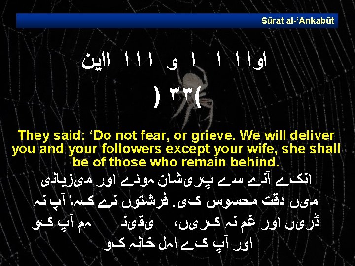 Sūrat al ‘Ankabūt ) ٣٢( ﺍ ﺍﺍﻳ We will deliver him and his followers, except his wife; she shall be of those who remain behind. ’ ﺳﻮﺍﺋے ﺍﻧکی ﺑیﻮی کے کہ ﻭہ پیچھے ﺭہ ﺟﺎﻧے ﻭﺍﻟﻮں ﻣیں ہﻮگی