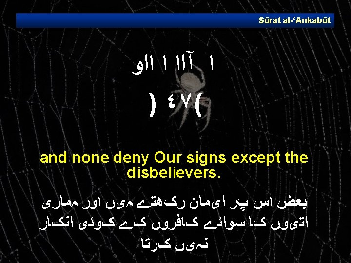 Sūrat al ‘Ankabūt ) آﺍ ﺍ ﻱ ﻭ ﺍﻳ ﻭﻭﺍ ﺍ ﺍ آﺍﺍ ﺍ ﺍﻟ ﺍﻭ ٤٩( Nay! It is a clear sign in the hearts of those who have been given knowledge; and none dispute Our signs except the unjust. ہے ﺍﻭﺭﺳﺮکﺸﻮں کے ﺳﻮﺍکﻮﺋی ہﻤﺎﺭی آیﺘﻮں کﺎ ﻣﻨکﺮ ﻧہیں