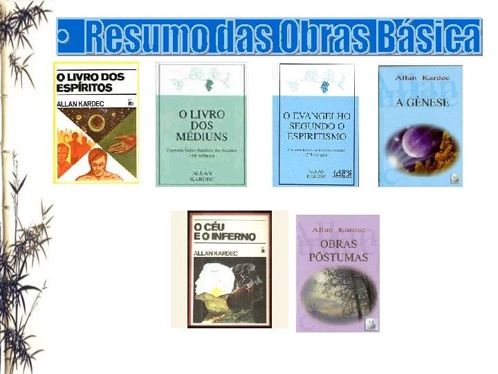 Obras básicas: • O Livro dos Espíritos (1857). • Revue Spirite ( publicação em 1858) • O Livro dos Médiuns (1861). • O Evangelho segundo o Espiritismo (1864). • O Céu e o Inferno (1865) • A Gênese (1868).