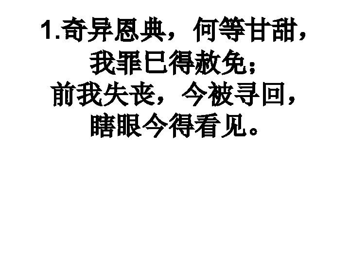 奇异恩典, 何等甘甜, Amazing Grace, how sweet the sound, 我罪已得赦免; That saved a wretch like me. . 前我失丧, 今被寻回, I once was lost but now am found, 瞎眼今得看见。 Was blind, but now, I see.