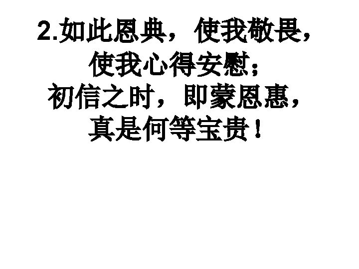 浩大恩典, 使我敬畏, T‘was Grace that taught. . . my heart to fear. 使我心得安慰; And Grace, my fears relieved. 初信之时即蒙恩惠, How precious did that Grace appear. . . 真是何等宝贵。 he hour I first believed.