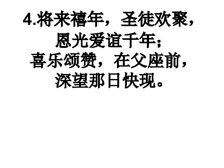 将来在天安居万年, When we‘ve been here ten thousand years. . . 恩光如日普照, bright shining as the sun. 好像最初蒙恩景况, We‘ve no less days to sing God’s praise. . . 赞美永不减少。 then we've first begun.
