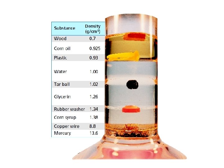 Density is the measure of mass per unit volume of a substance. • D = m/v • Density changes with temperature. Cold water is denser than warm water. If combined, the cold water would sink to the bottom of the warm water. • Density will change with physical state of matter. Ice is less dense than water. That means ice will float in water because ice expands when it freezes causing it to have a greater volume. • Water has a density of 1 g/m. L. Density Which is liquid water and which is ice (solid water)? How do you know the difference?