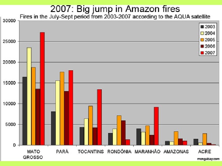On September 29, 2007, the Moderate Resolution Imaging Spectroradiometer (MODIS) on NASA’s Aqua satellite captured this image of the southern Amazon, showing widespread fires (locations marked in red) in the state of Mato Grosso, Brazil. NASA image courtesy the MODIS Rapid Response Team, Goddard Space Flight Center.