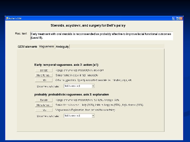 Summary n Vagueness is a common problem in CPG recommendations n “Classic” (i. e. semantic) ambiguity is uncommon n Distinct forms of vagueness and ambiguity require specific remedies n When deliberate vagueness is deemed necessary, end -user uncertainty should be minimized n Clarification of deliberate vagueness must consider the rationale for the vagueness