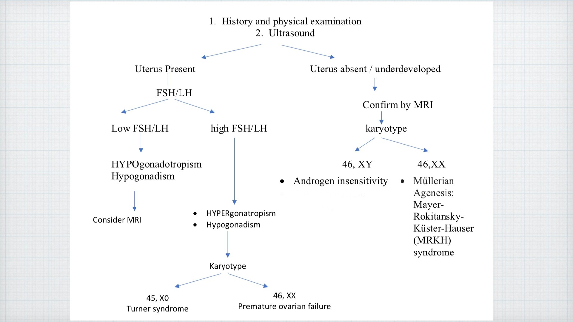 To know where is the problem in HPO axis by: Fs. H: If high : ovarian cause ( no estrogen ) , so we do karyotype ( could be 45 XO or 46 XX ) If low : hypothalamus or pituitary cause If normal : it’s usually in secondary amenorrhea and 2 ary sexual characteristics will be present
