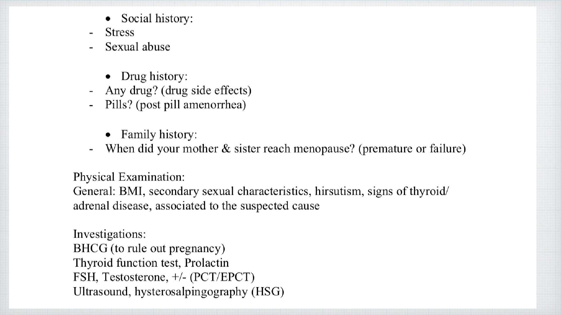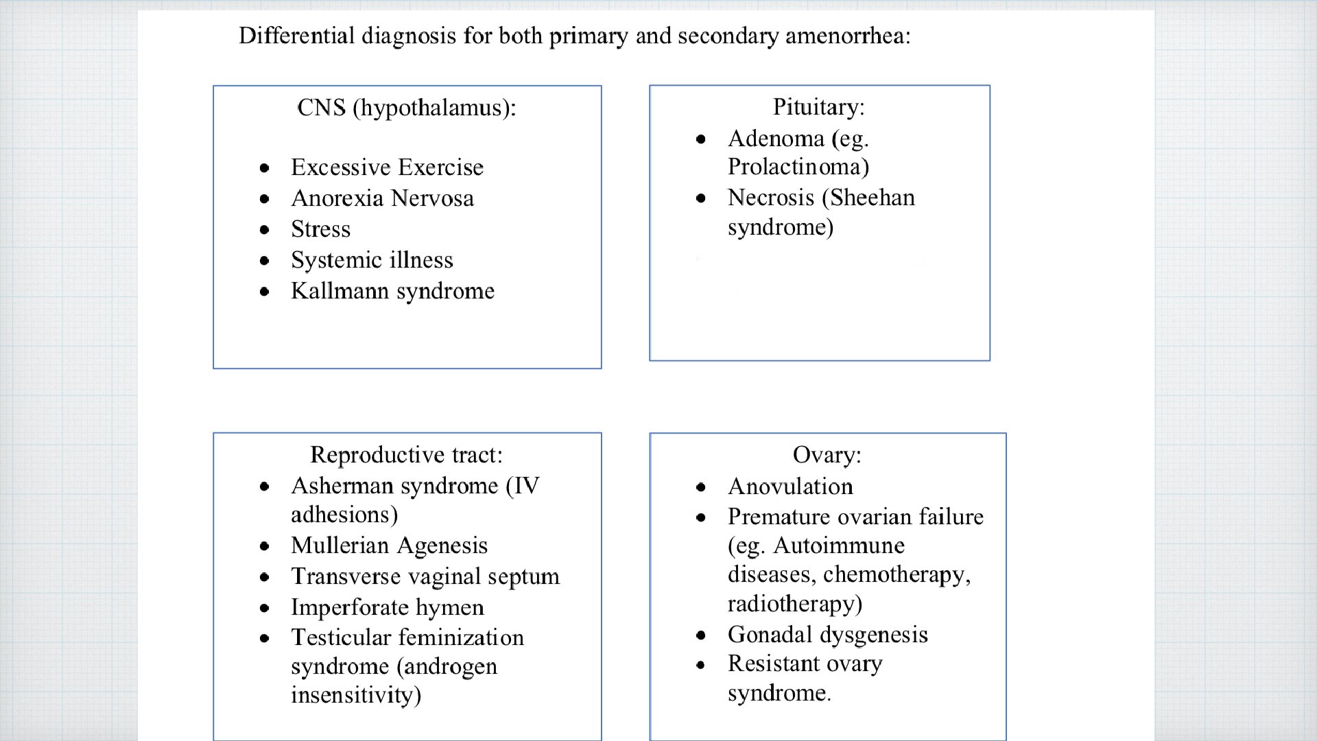 Causes : 1 - outflow tract obstruction 2 -uterine causes 3 - ovarian causes 4 - pituitary causes 5 - hypothalamus causes