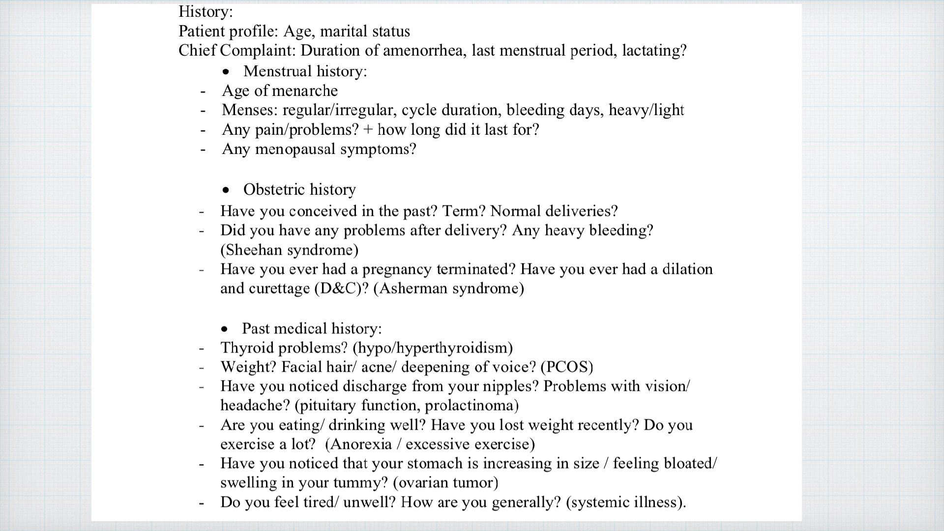 Amenorrhea ( the absence of menses). Physiological : before puberty, pregnancy, lactation , menopause Primary : Absence of menses at age 14 without secondary sexual characteristics OR. Absence of menses at age 16 with secondary sexual characteristics Secondary : (in a female who is menstruating) -Absence of menses for 3 consecutive cycles (if regular) or 6 months (if irregular).
