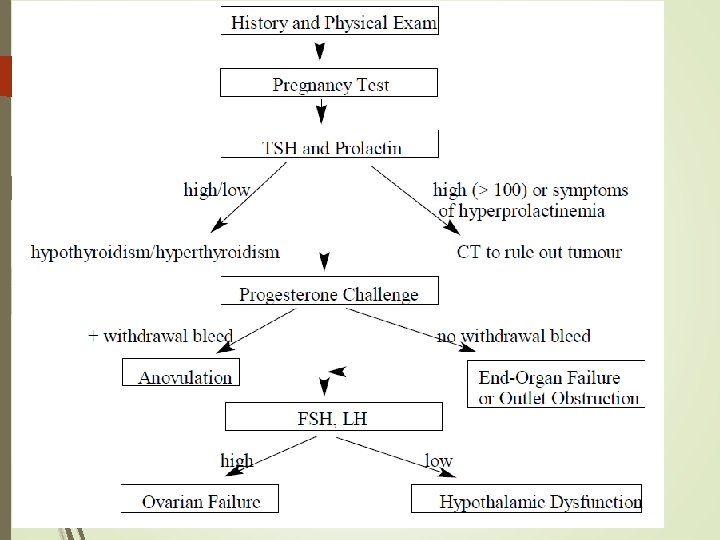 History. RULE OUT PREGNANCY. Menstrual history: age at menarche, LMP, previous menstrual pattern, diet, medications, stress. Galactorrhea, radio/chemotherapy, weight loss/gain. Intense exercise/ dieting Estrogen deficiency – hot flushes, night sweats.
