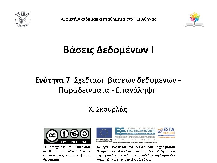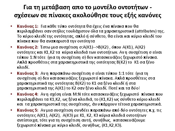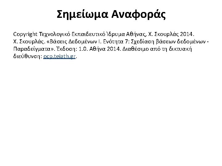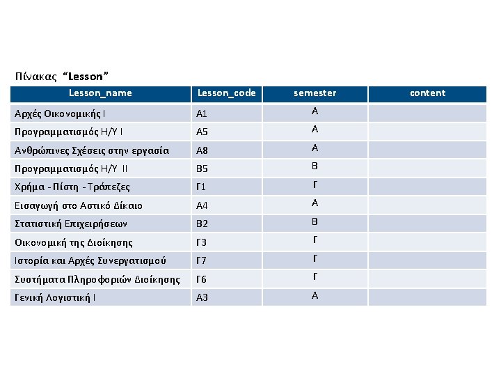 Πίνακας “Student” Surname Κυριακόπουλος Αποστόλου Παπαπέτρου Ζευγαρίδης Κοταμανίδου name Νικηφόρος Ζωή Νικόλαος Ορέστης Ειρήνη Student_code 213 816 450 346 610 semester Δ Α Β Γ Α Address Θησέως 3 Αριάδνης 1 Ειρήνης 4 Αίγλης 10 Ειρήνης 7 birthdate 10/10/86 10/10/89 23/9/88 2/2/89 phone 2101234567 2102345897 2109923456 2108223469 2107323434 Πίνακας “Professor” Surname Codd Ullman Widom Elmasri Navathe Name address Professor _code Ted Mass. 10 Jeffrey Calif. 20 Jennifer Calif. 30 Ramez Mass. 40 Shamkant Mass. 50 Phone Birthdate 2109134567 2108345897 2107723456 2102343469 2107555434 10/10/56 10/10/59 23/9/58 12/2/59 Office_ Number 201 110 231 123 speciality Πληροφορική Ηλεκτρονική