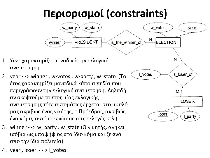 Βάση αμερικανικών προεδρικών εκλογών (American elections) • Στο δείγμα παρατίθενται εκλογικά αποτελέσματα για τις αναμετρήσεις από το 1952 έως το 1992. Κύριο κλειδί (year, loser). YEAR 1952 1956 1960 1964 1968 1972 1976 1980 1984 1988 1992 WINNER EISENHOWER KENNEDY JOHNSON NIXON CARTER REAGAN BUSH CLINTON W_VOTES 442 447 303 486 301 520 297 489 525 426 NULL W-PARTY REP DEM REP REP DEM W_STATE TEXAS MASS. TEXAS CALIF. NULL NULL LOSER STEVENSON NIXON GOLDWATER HUMPHREY WALLACE Mc. GOVERN FORD CARTER ANDERSON MONDALE DOUKAKIS BUSH PERAULT L_VOTES 89 73 219 52 191 46 17 240 49 0 13 41 NULL L_PARTY DEM REP DEM IND DEM DEM REP IND REP=REPUBLICAN , DEM=DEMOCRAT , IND=INDEPENDENT Η αναγραφή NULL σε μια θέση του πίνακα σημαίνει ότι η αντίστοιχη στήλη δεν έχει τιμή.