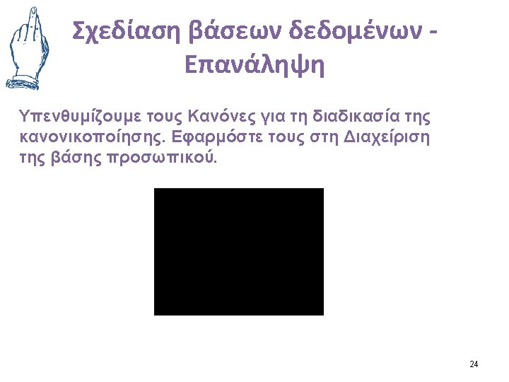 Απλοποιημένη βάση διαχείρισης προσωπικού (personnel) ENAME EXPR SAL 3 EMP NO 100 4 1200 020 BUDGE P_TIME T ΑΠΟΘΗΚΕΣ 100000 80 FORTR 200 AN 77 COBOL 100 2 100 4 1200 010 ΕΡΓΟ Α 200000 20 3 100 4 1200 010 ΕΡΓΟ Α 200000 20 FORTR 200 AN 77 ΚΑΜΑΡAΣ COBOL 100 2 100 4 1200 020 ΑΠΟΘΗΚΕΣ 100000 80 2 200 3 1150 010 ΕΡΓΟ Α ΚΑΜΑΡAΣ PL/I, 1 300 1 200 3 1150 ΣΠΥΡΟΥ 4 300 4 1450 020 ΑΠΟΘΗΚΕΣ 100000 100 ΒΑΛΑΚΟΣ LANG_ UAGE CODE COBOL 100 ΒΑΛΑΚΟΣ COBOL 100 USE P_CODE PNAME σύνθετο κύριο κλειδί = (EMPNO, LANG_CODE, P_CODE) Σχήμα Πρώτη κανονική μορφή βάσης δεδομένων προσωπικού 200000 100