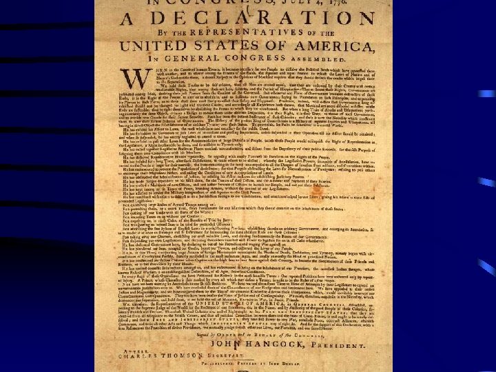 The Declaration of Independence • • July 4, 1776 Largely written by Thomas Jefferson List of grievances against the King List of rights of the people (unalienable rights, among these are Life, Liberty and pursuit of Happiness)