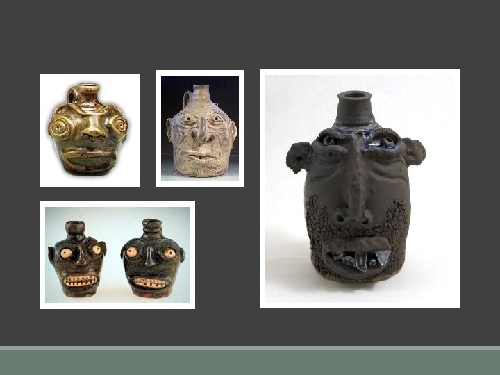 Depicting a face on jugs and jars is neither new nor rare. For centuries, anthropomorphic pottery has been made in England, Germany, Peru, Japan, Africa, Egypt and Mexico. Their uses have ranged from ritualistic and funerary to honoring nobility. In the United States, face jugs and vessels were made beginning around 1810, and the southern region has been the world’s most prolific region for face vessels. http: //video. pbs. org/video/1918318256/